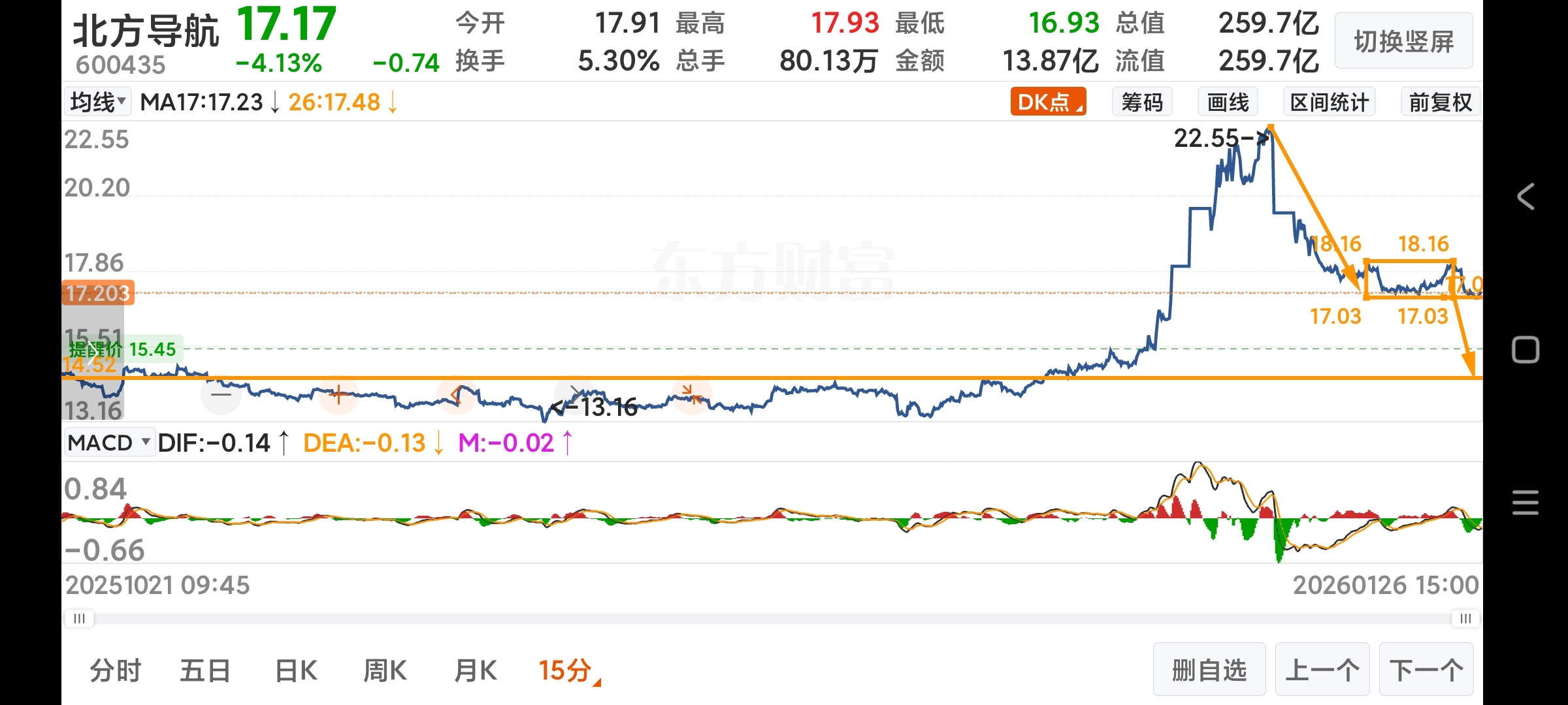 $北方导航(SH600435)$ 如果真有效跌破17.04可能真的要走这样的结构了!今天没跌破收回来了!目前套我三分钱