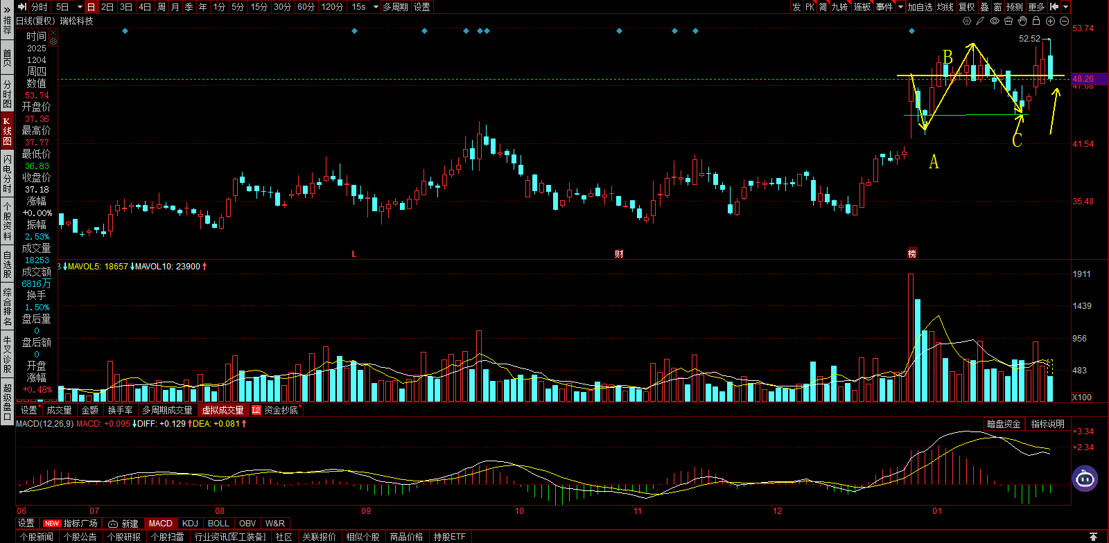 瑞松科技,可以打底仓。长阴短柱,横盘整理。
