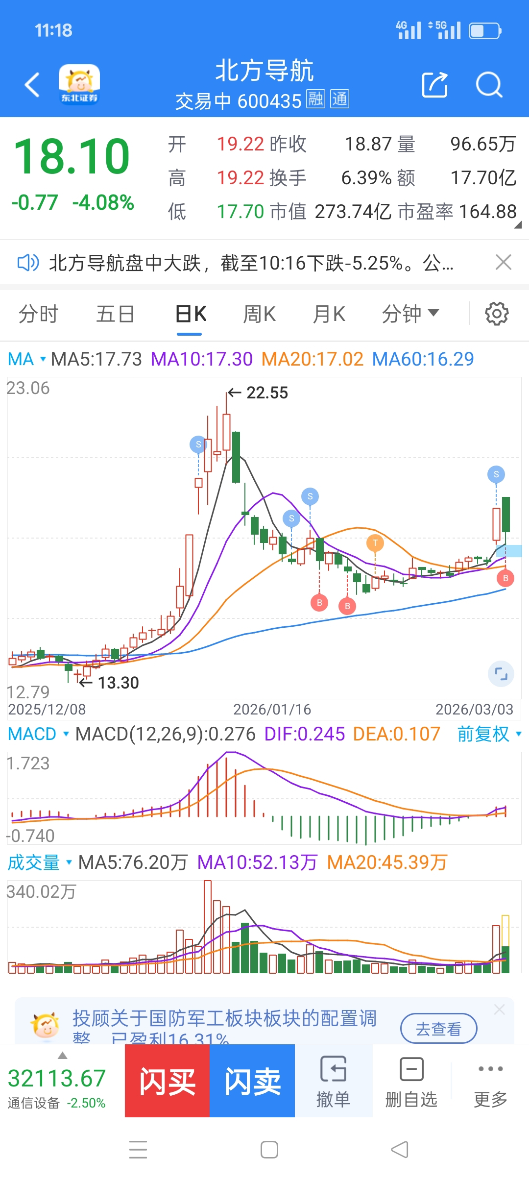 $北方导航(SH600435)$ 卖出是对的