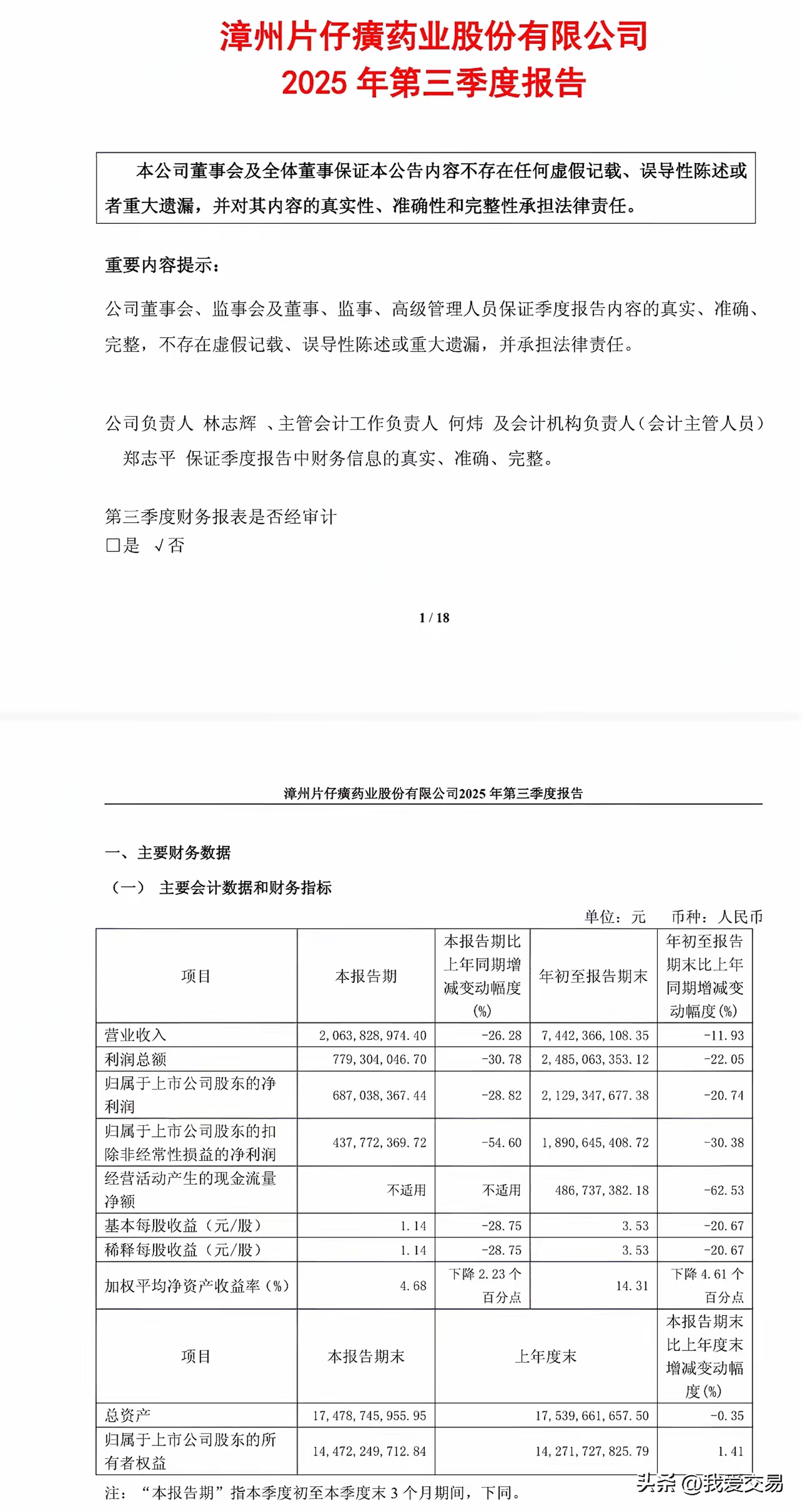 片仔癀2025年第三季度实现营业收入20.64亿元,同比下降26.28%;净利润为6.87亿元,同比下降28.82%;扣非净利润为4.38亿元,同比下降54.6%。