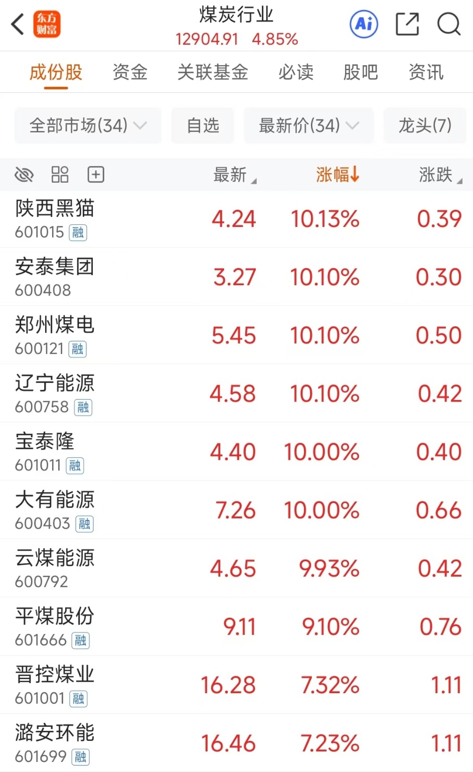 10月20日,煤炭行业大涨4.85%,居行业涨幅榜首位。板块中陕西黑猫、郑州煤电、辽宁能源、安泰集团、大有能源,宝泰隆、云煤能源纷纷涨停。
