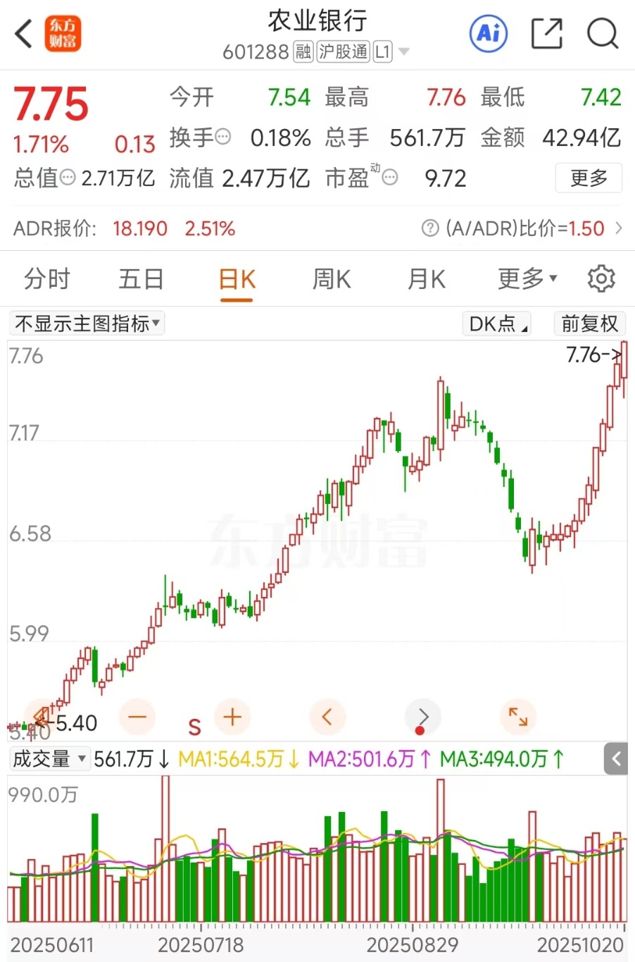 除了煤炭,银行又是另一个典型。比如农业银行,该股自9月25日开始,迄今已录得12连阳。10月20日盘中,农业银行最高触及7.76元,股价再创历史新高。今年以来,农业银行累计上涨51.96%。