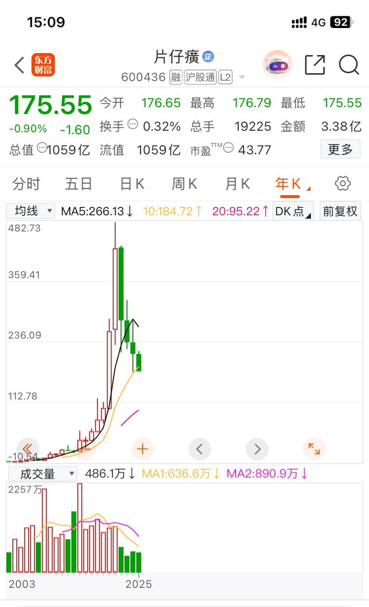 $片仔癀(SH600436)$ 好消息是已经跌了4年,坏消息是缩量下跌,而且是大幅缩减。
