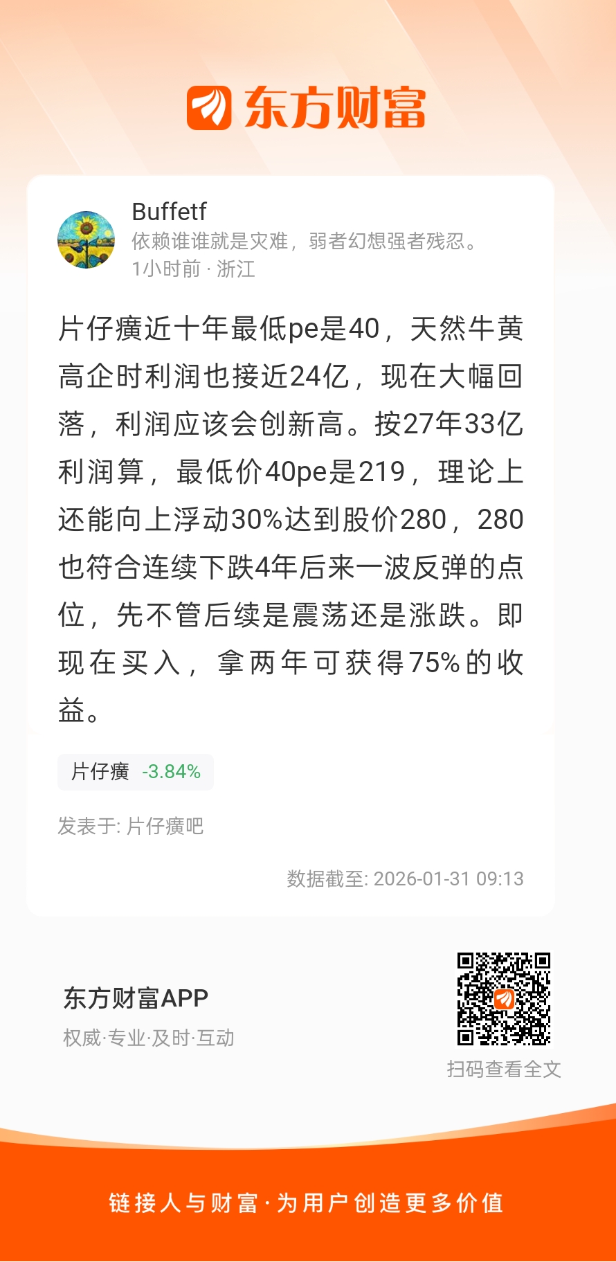 片仔癀近十年最低pe是40,天然牛黄高企时利润也接近24亿,现在大幅回落,利润应该会创新高。按27年33亿利润算,最低价40pe是219,理论上还能向上浮动30%达到股价280,280也符合连续下跌4年后来一波反弹的点位,先不管后续是震荡还是涨跌。即现在买入,拿两年可获得75%的收益。