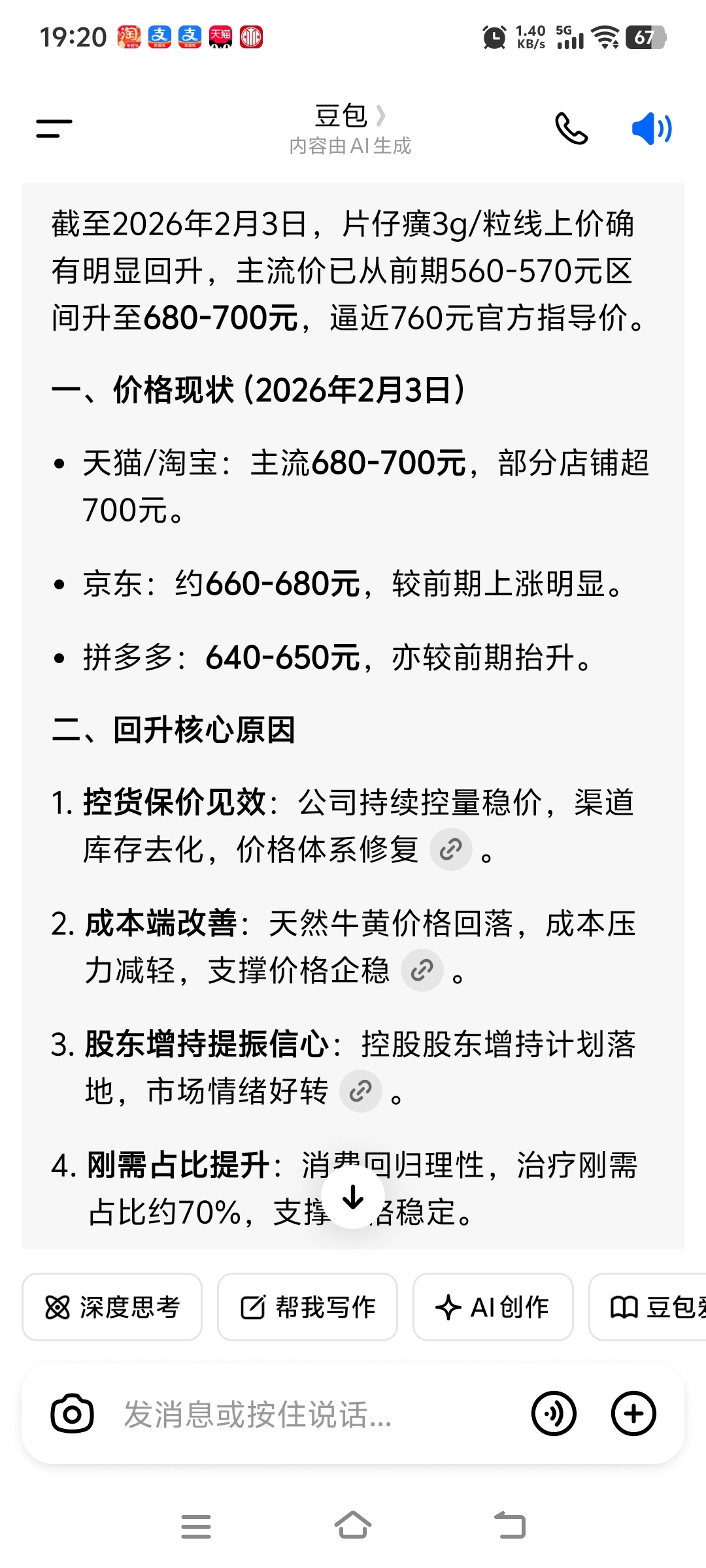 $片仔癀(SH600436)$ 片仔癀控量保价效果很好,之前京东旗下京喜目前价格回升到了760。线上价格回升很明显,连拼多多都到了650了,线上有量的基本到680-700区间。估计春节前会继续回升靠拢760的价格,这波以量换价清库存速度还是很快的,目的就是拿回市场定价权。加上牛黄暴跌,2025年报和今年1季度业绩已经是过去式,不必纠缠业绩,三季度业绩大幅增长板上钉钉事。