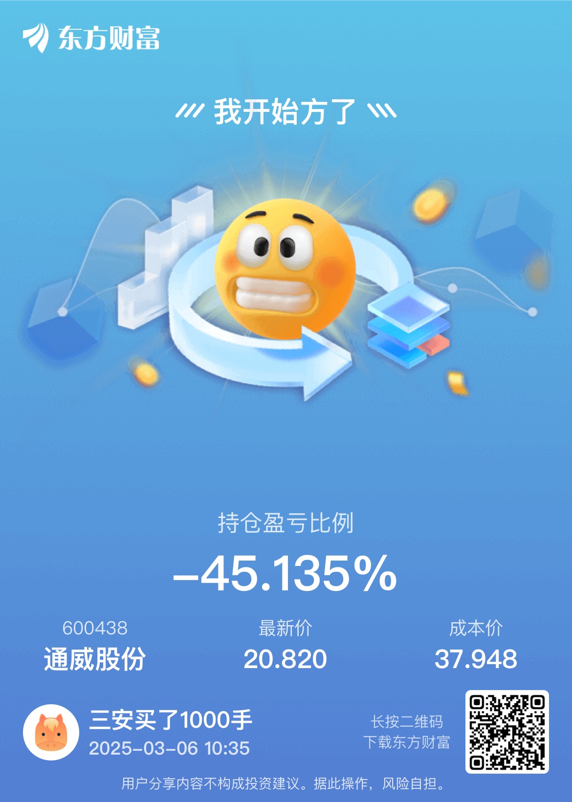 温馨提示: 1.根据《证券法》规定,禁止编造、传播虚假信息或者误导性信息,扰乱证券市场;2.用户在本社区发表的所有资料、言论等仅代表个人观点,与本网站立场无关,不对您构成任何投资建议。用户应基于自己的独立判断,自行决定证券投资并承担相应风险。《东方财富社区管理规定》