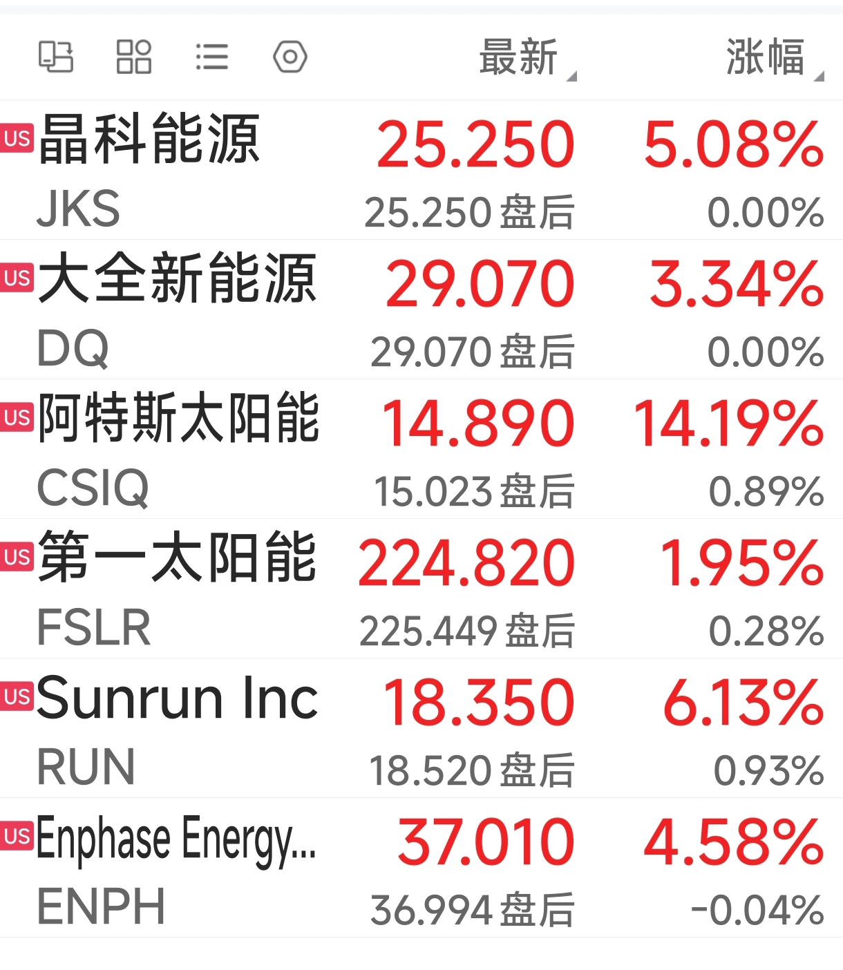 周三美股收盘,光伏龙头大涨,如图。