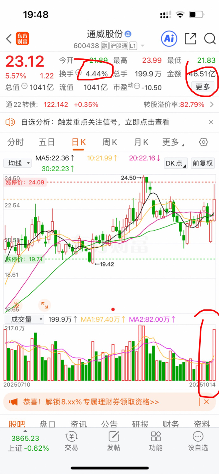 $通威股份(SH600438)$ 今天差不多涨停我并没有慌慌张张卖出,也没有做T,我不操作理由是:量、换手率、资金都有了,我更看好的是后期,或许有调整,但问题不大。早上补了缺口,大盘下跌压力还是有,下午回调在k线附近震荡,证明也有相应支撑位了,也有人接筹码了。还是很期待后期走势。