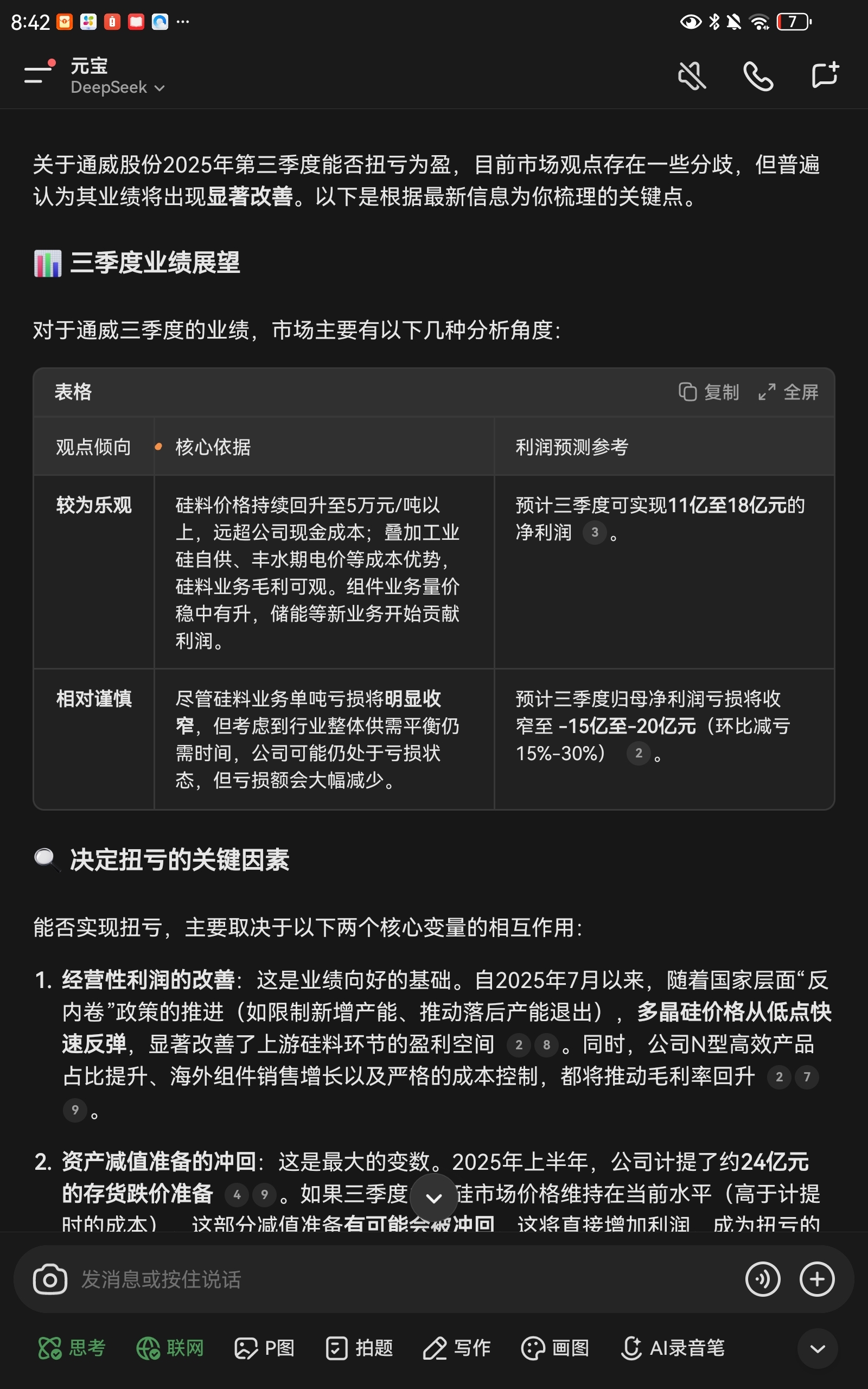 $通威股份(SH600438)$ 问了一下DeepSeek,通威三季度能否扭亏为盈。