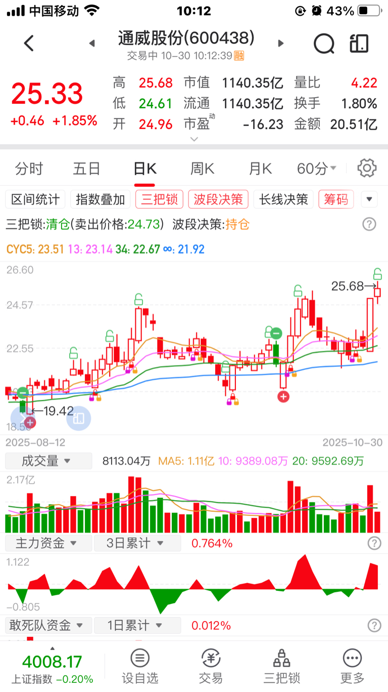 $通威股份(SH600438)$ 完了、小绿锁来了,今天主力出货了,先出了吧。