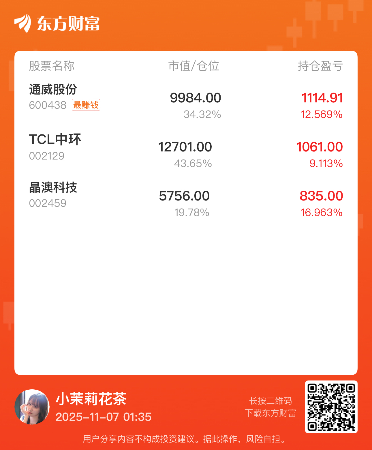 #复盘记录# $通威股份(SH600438)$ 小金额学习金融中,看好光伏的长期投资,把比较分散的持仓调整到光伏占比较高了。在别的地方持有两成仓的隆基和少量光伏etf(比较少,主要吃一些阳光和特变的成长),欢迎友好交流#炒股日记#