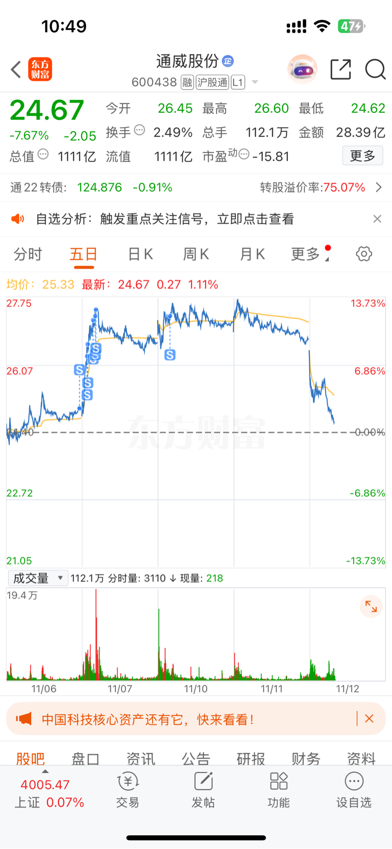 $通威股份(SH600438)$ 如果到22-23马上进~目前底仓不动,暂时不操作了,懒得做t了