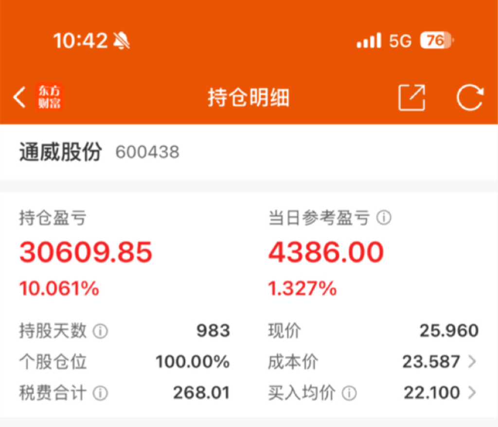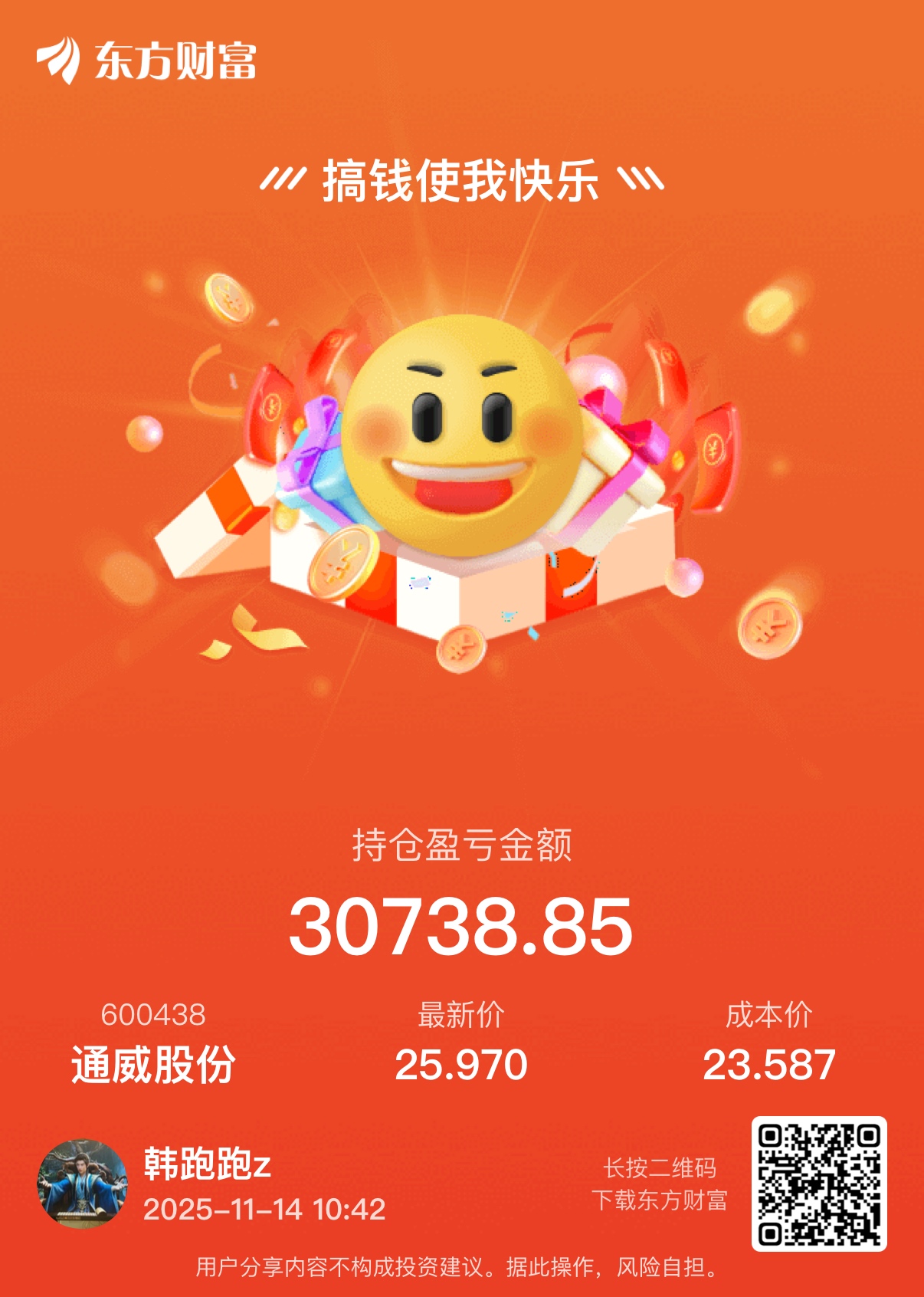 $通威股份(SH600438)$ 持有3年,只赚了这点,不知道为什么,也不想卖出,一直加仓,从开始的10w,加到现在,感觉年底至少40。也该轮到光伏吃肉了吧