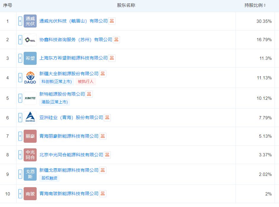 光和谦成注册资本30亿元,共有10名股东,包括9家硅料企业。其中包括:新特能源(HK01799),大全能源(SH688303),通威股份旗下的通威光伏科技(峨眉山)有限公司,南玻A(SZ000012)旗下的深圳南玻新能源产业发展有限公司,协鑫科技咨询服务(苏州)有限公司,中国光伏行业协会全资持有的北京中光同合能源科技有限公司,等等。