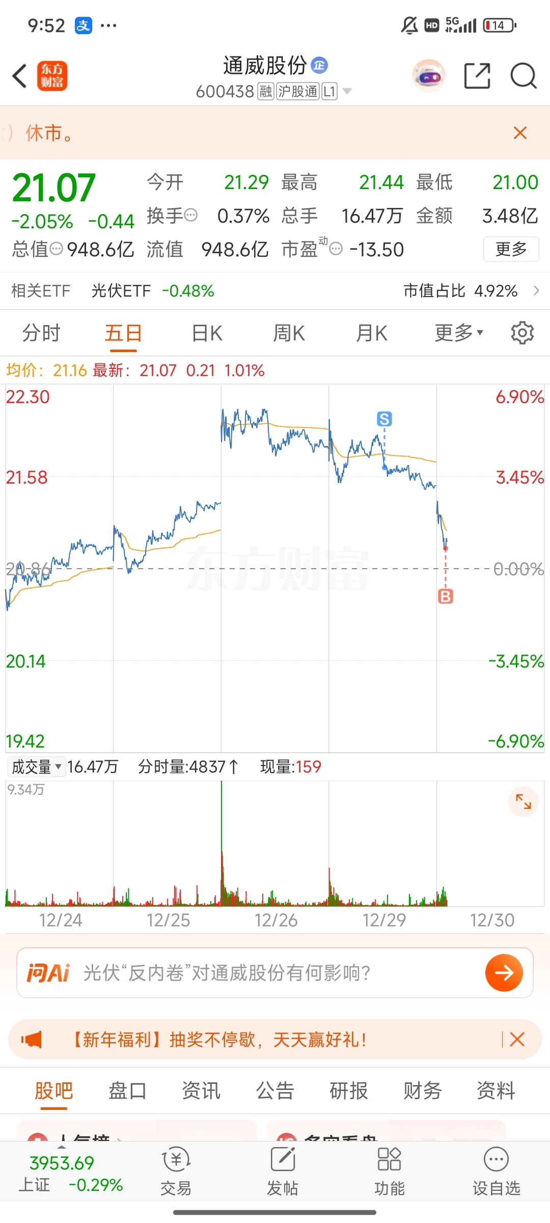 $通威股份(SH600438)$ 继续做t降成本吧,唉,套死我了