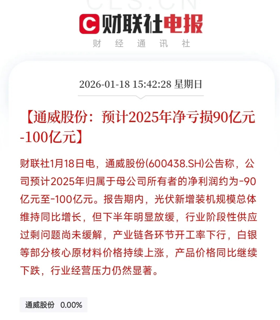 难怪光伏一直起不来,通威股份最新业绩:预计2025年净亏损约90亿元至100亿元。