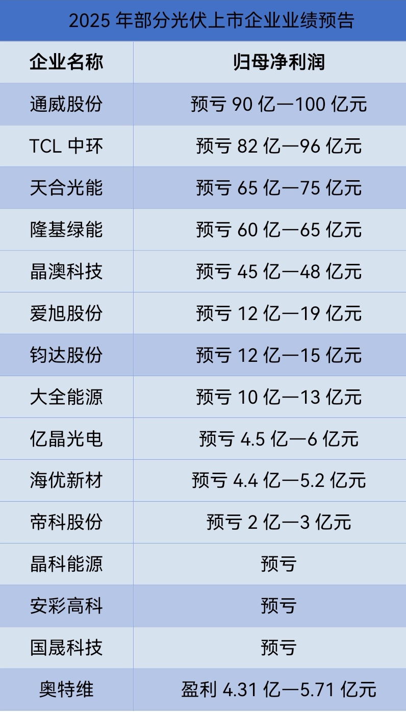 截至2026年1月19日,已有至少15家光伏上市公司披露2025年业绩预告。其中,通威股份(600438.SH)、TCL中环(002129.SZ)、天合光能(688599.SH)、隆基绿能(601012.SH)、晶澳科技(002459.SZ)、大全能源(688303.SH)、爱旭股份(600732.SH)、钧达股份(002865.SZ)、亿晶光电(600537.SH)、海优新材(688680.SH)、帝科股份(300842.SZ)等11家企业的归母净利润合计预亏386.9亿元至445.2亿元。