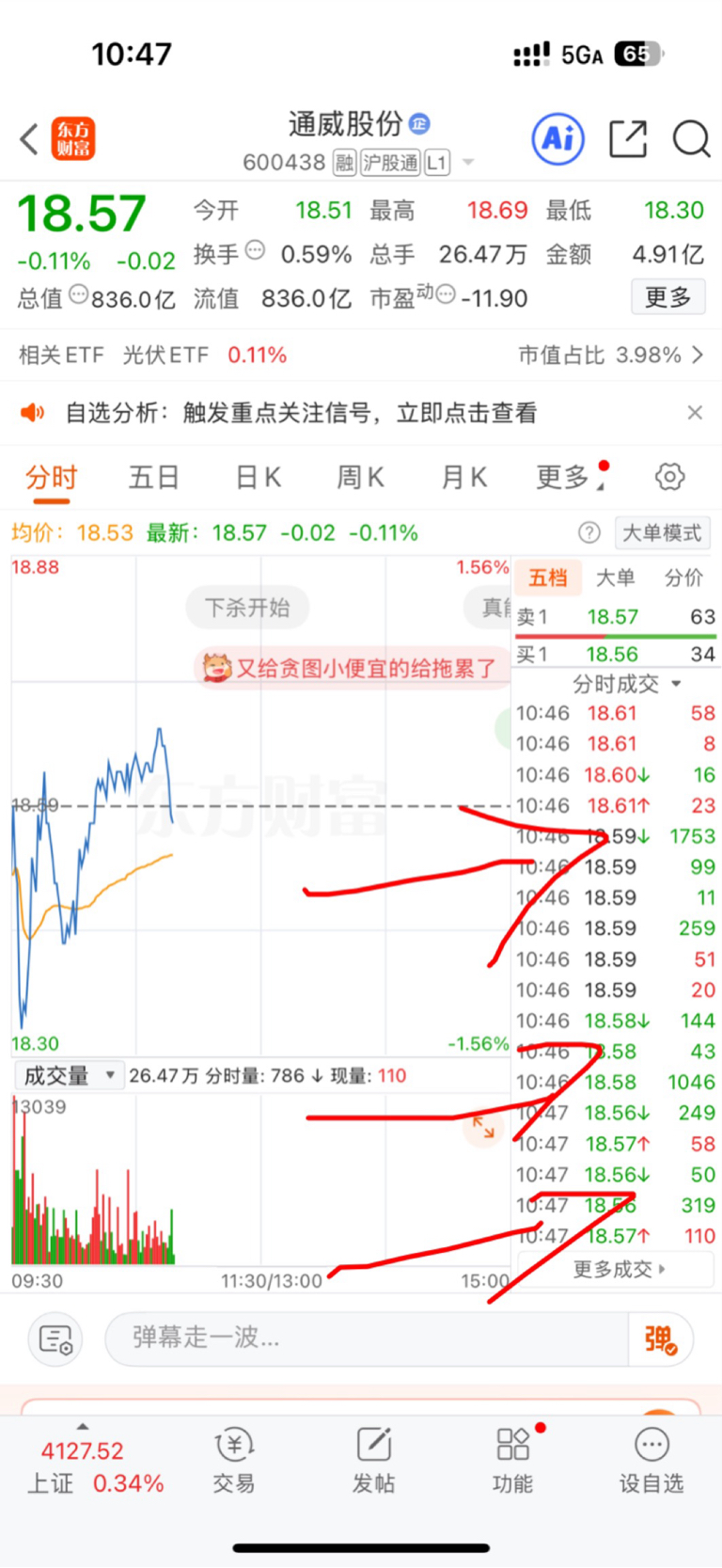 $通威股份(SH600438)$ 还是有很多大单子不看好这个股的,愿意无条件低价卖的,现在卖方的意思就是给钱我就卖,可能未来这个股会一文不值,