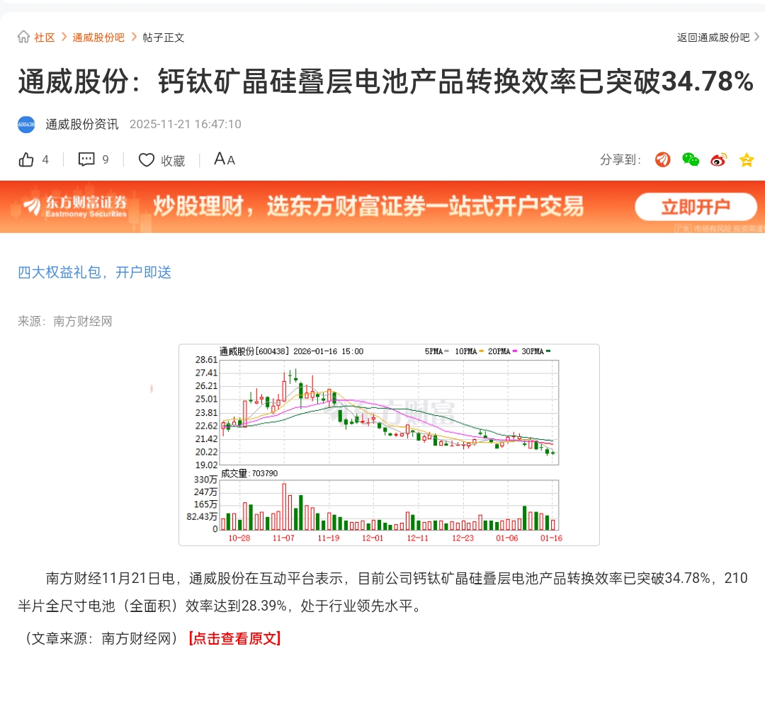 【通威股份】一一的太空光伏电池一一钙钛矿晶光伏电池,处于行业领先水平——却不涨…