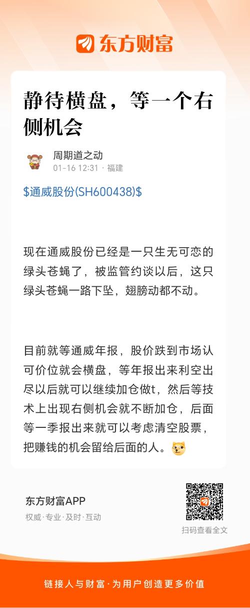目前就等通威年报,股价跌到市场认可价位就会横盘,等年报出来利空出尽以后就可以继续加仓做t,然后等技术上出现右侧机会就不断加仓,后面等一季报出来就可以考虑清空股票,把赚钱的机会留给后面的人。