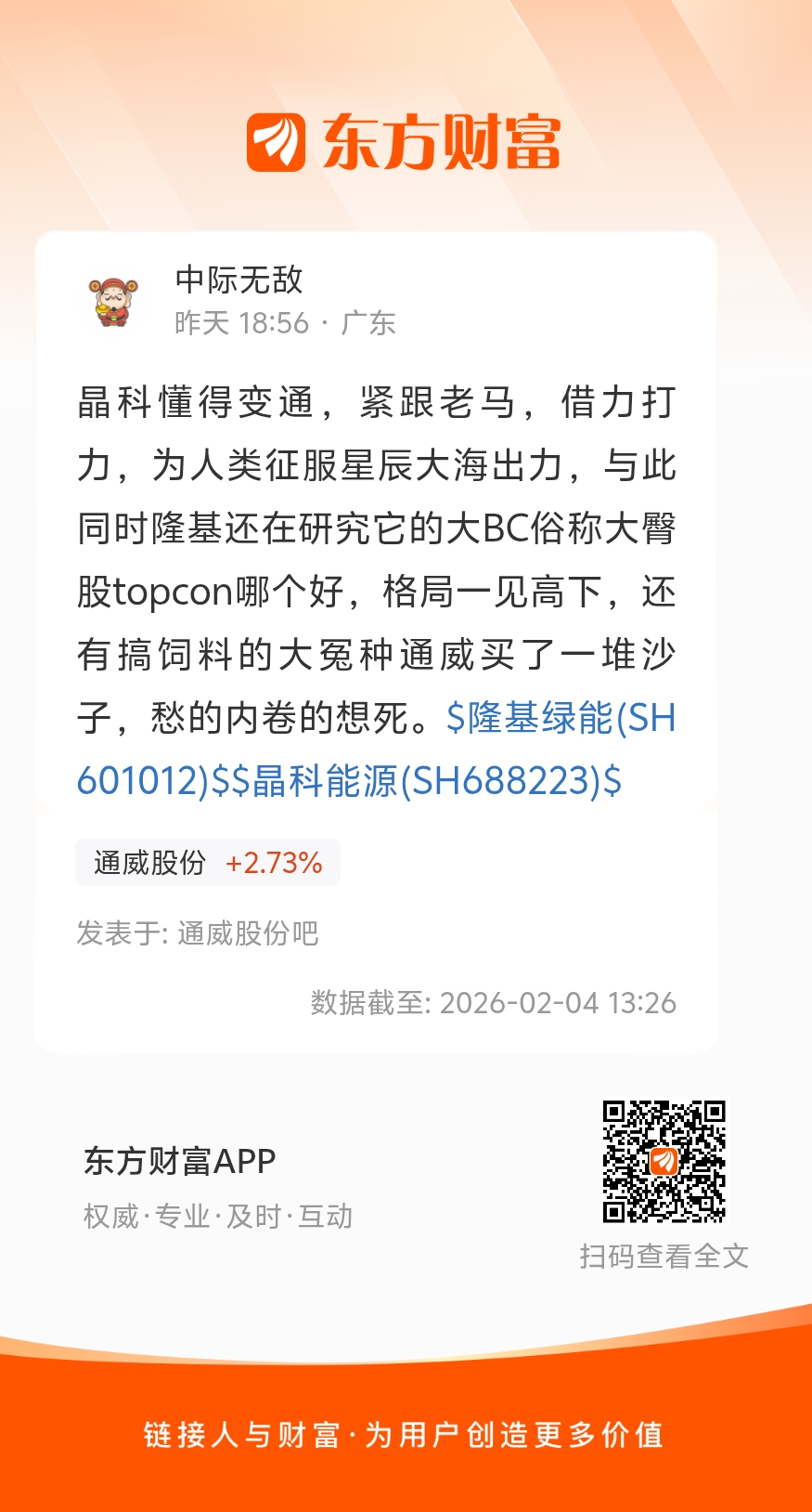 晶科懂得变通,紧跟老马,借力打力,为人类征服星辰大海出力,与此同时隆基还在研究它的大BC俗称大臀股topcon哪个好,格局一见高下,还有搞饲料的大冤种通威买了一堆沙子,愁的内卷的想死。$隆基绿能(SH601012)$$晶科能源(SH688223)$