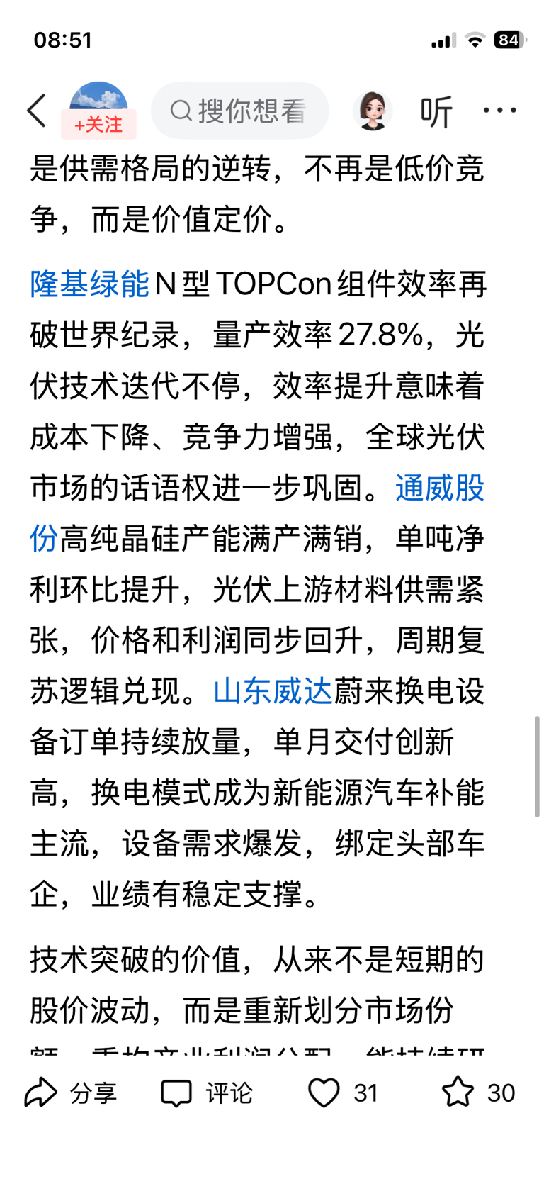 $通威股份(SH600438)$ 通威股份高纯晶硅产能满产满销,单吨净利环比提升,光伏上游材料供需紧张,价格和利润同步回升,周期复苏逻辑兑现。