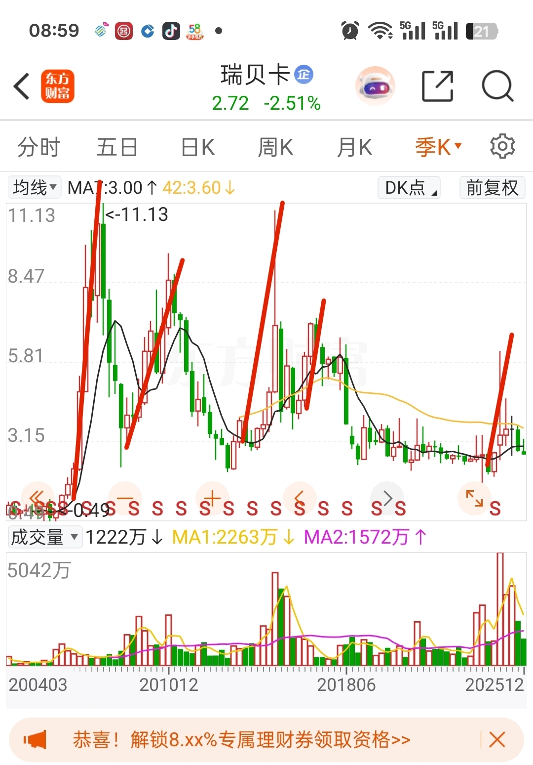 $瑞贝卡(SH600439)$ 从季线或月线看,应该还有一波,高点在4.5元左右。