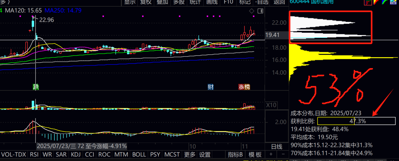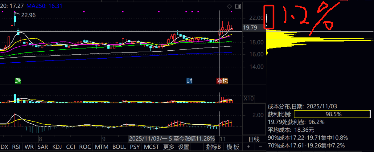前面两根大阴线套牢盘53%,到近期涨停的那个根线只剩下1.2%的套牢盘,抛压不重了,应该还会下打一下清洗下涨停那天的浮筹再往上打,热点非常热,有筹码的拿好不要被震走了,个人愚见,仅供参考。