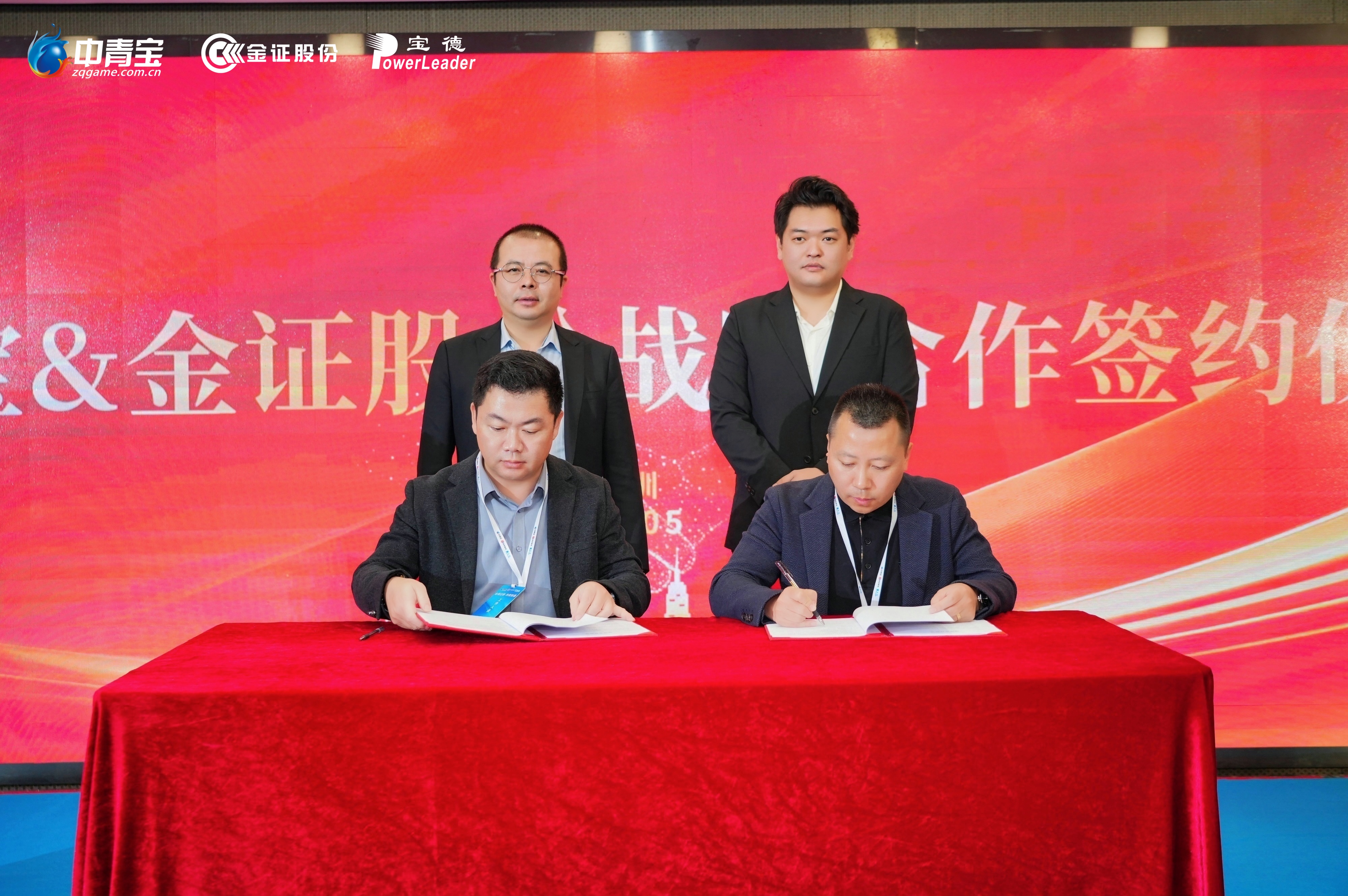 在中青宝董事长李逸伦和金证股份总裁王清若的共同见证下,中青宝总经理梁海栋与金证股份子公司金微蓝执行总经理涂洪川分别代表双方企业签署战略合作协议。