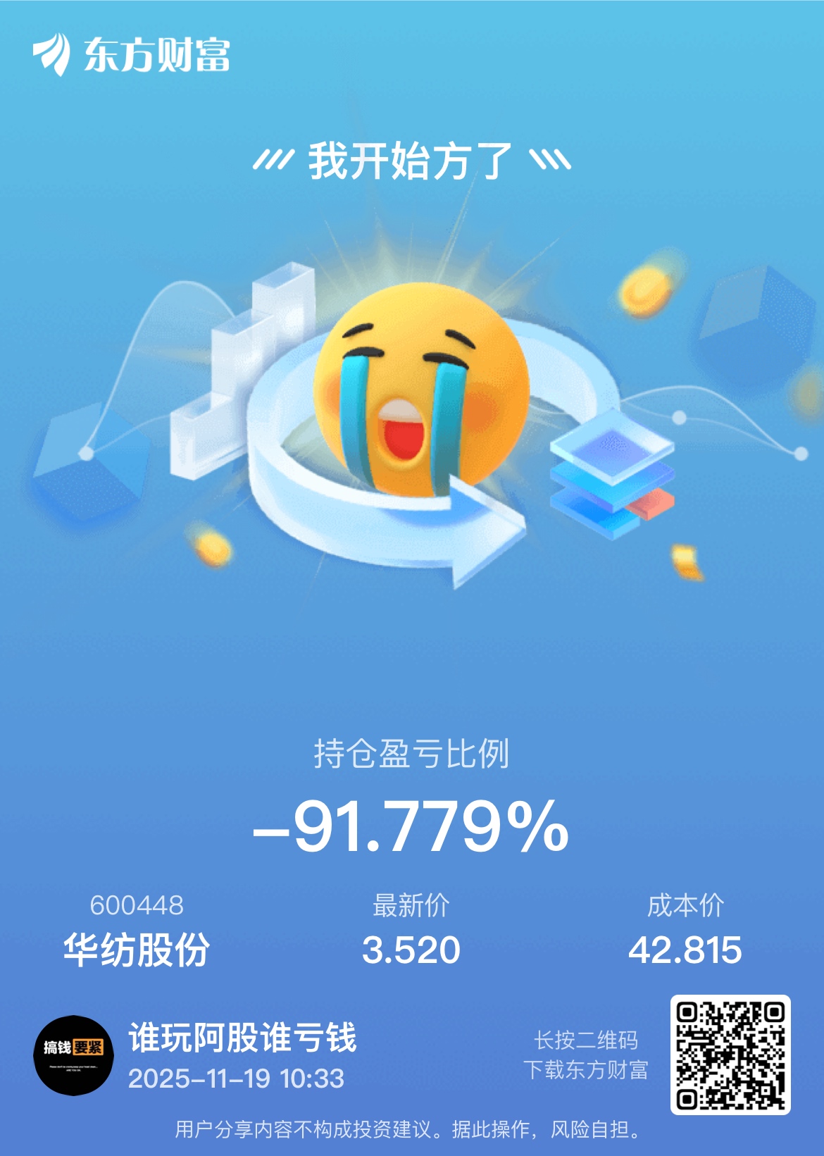 $华纺股份(SH600448)$ 清仓走了 跌回3.3左右再来看看了
