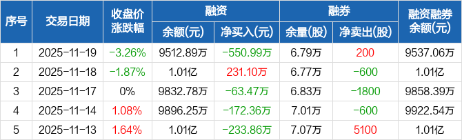 融资方面,当日融资买入884.03万元,融资偿还1435.02万元,融资净偿还550.99万元。融券方面,融券卖出1800股,融券偿还1600股,融券余量6.79万股,融券余额24.17万元。融资融券余额合计9537.06万元。