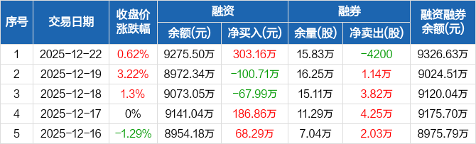 华纺股份:融资净买入303.16万元,融资余额9275.5万元(12-22)