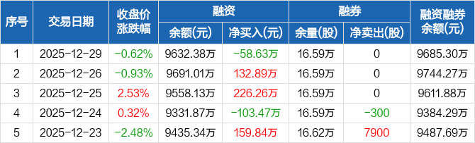 华纺股份:融资净偿还58.63万元,融资余额9632.38万元(12-29)