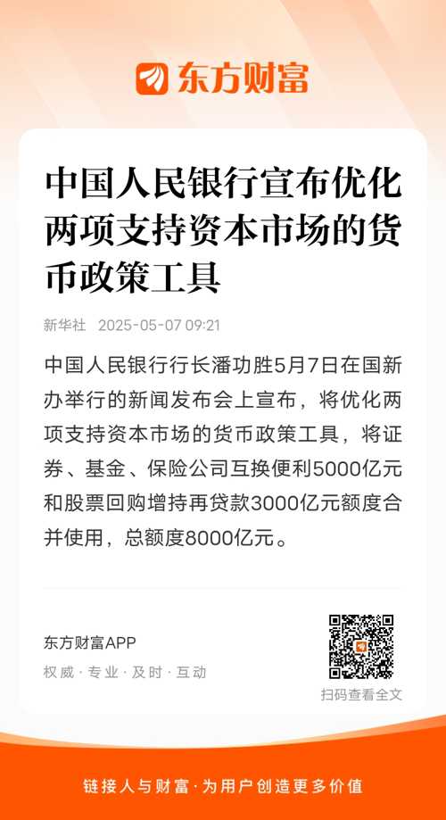 中国人民银行行长潘功胜5月7日在国新办举行的新闻发布会上宣布,将优化两项支持资本市场的货币政策工具,将证券、基金、保险公司互换便利5000亿元和股票回购增持再贷款3000亿元额度合并使用,总额度8000亿元。