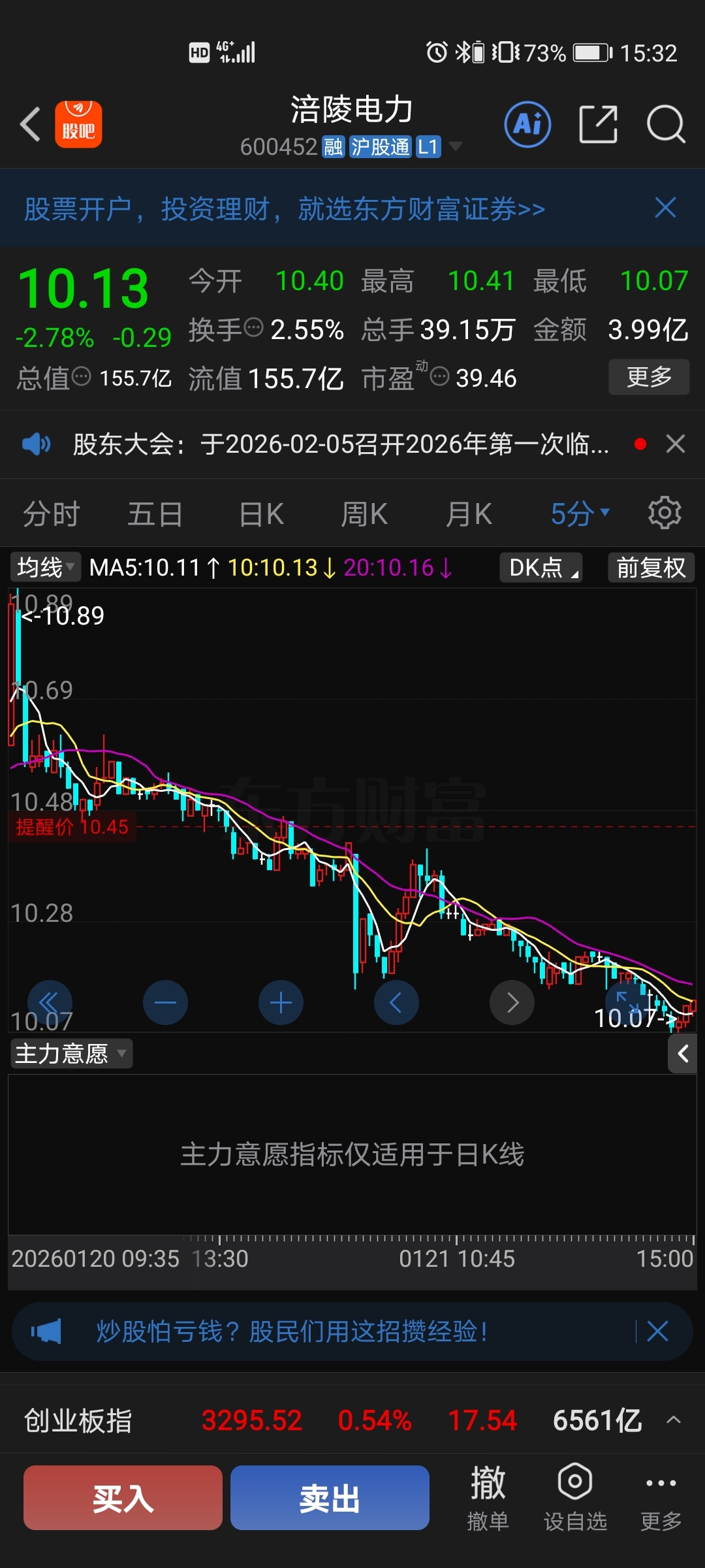 $涪陵电力(SH600452)$ 5分钟K线已破位下跌,近期无反弹,注意减仓!