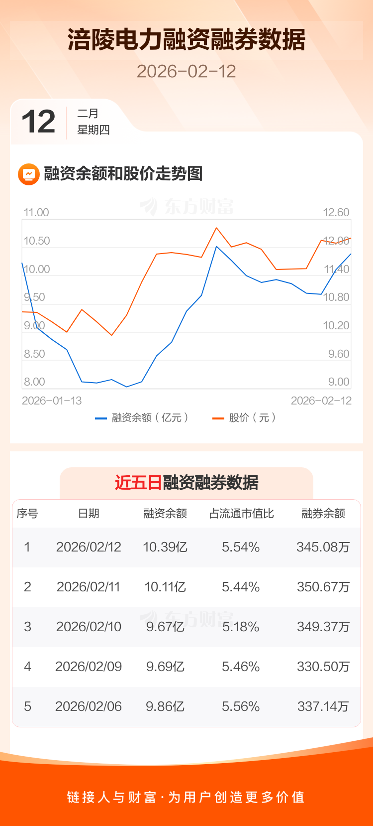 交易所最新数据显示,涪陵电力于2026年2月12日获融资买入8312.00万元,融资偿还5501.74万元,当日融资净买入2810.26万元。目前,该股融资余额10.39亿,占流通市值比例为5.54%。