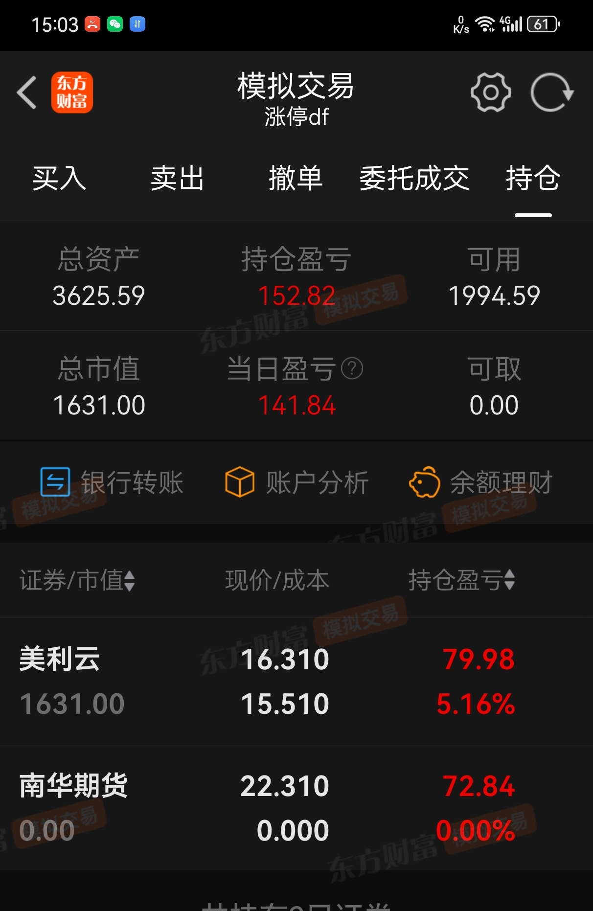 模拟卖出南华期货,买入美利云(涨停)