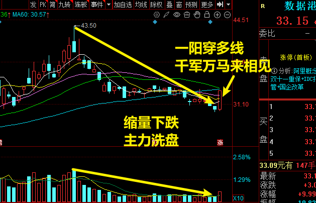 股价从前期最高点43.5一路向下调整到目前33,整体股价属于低位,缩量调整,主俚洗盘,在周四突然放出倍量张停,形成一阳穿多线的走势,短期主俚将开启强势进攻,目前属于行情刚刚启动,今天股价有溢价空间,高开3个点内可以直接上车。