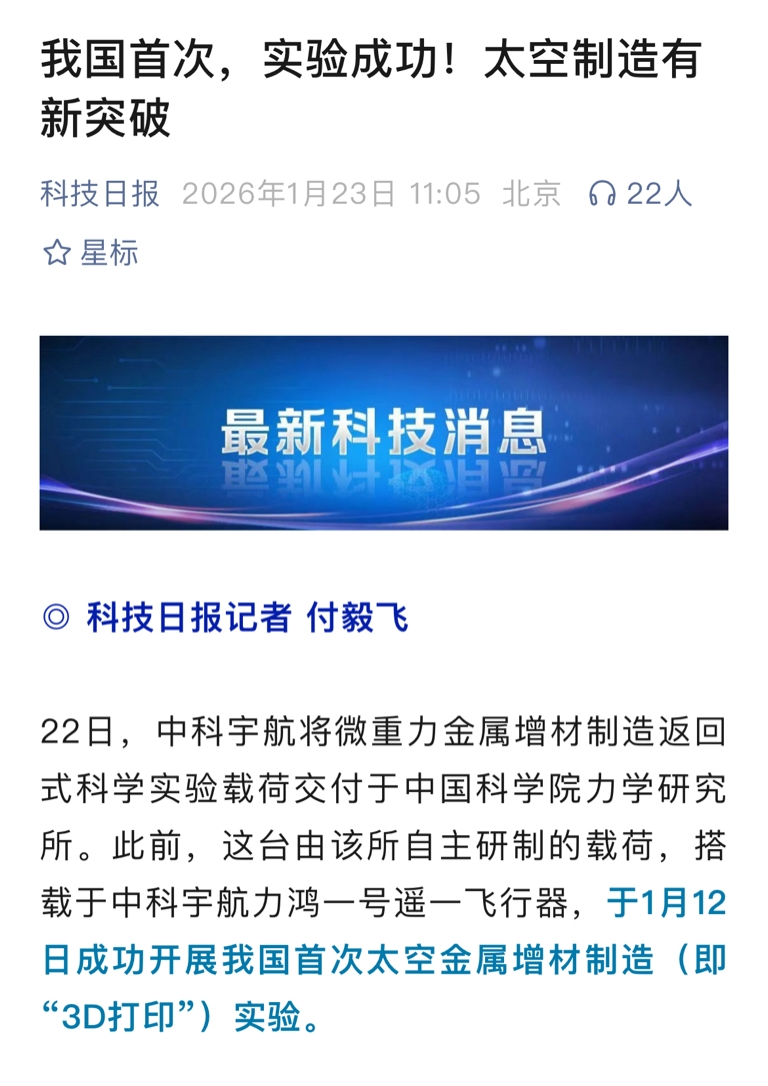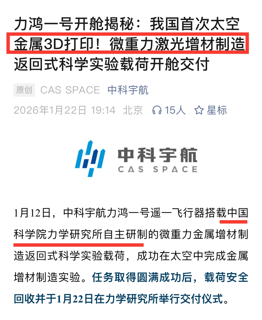最新消息:我国首次实现“太空3D打印制造”!宝钛股份3D打印即将。。。