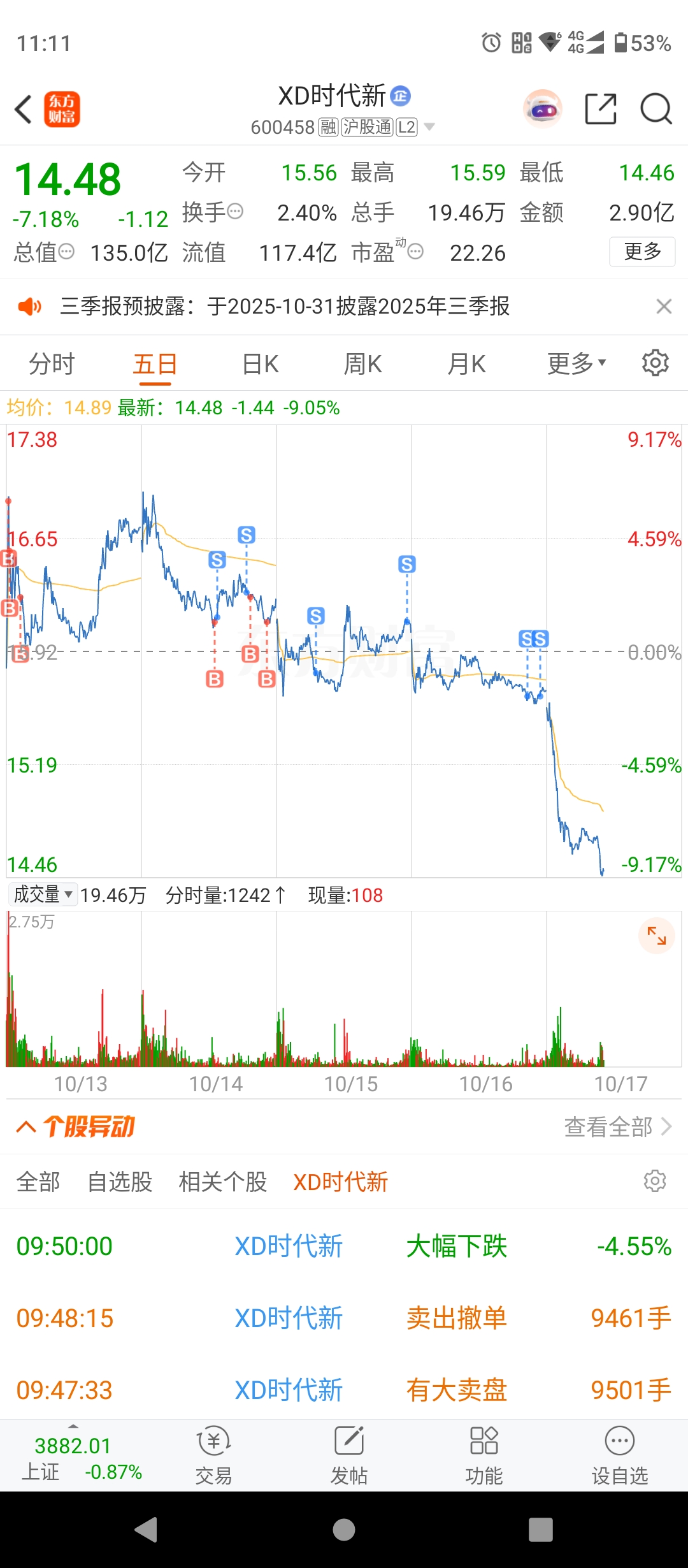 $XD时代新(SH600458)$ 看看我这SB战法,马入后一直跌,发利好,就是割我这小韭菜的。昨天亏4%割了。
