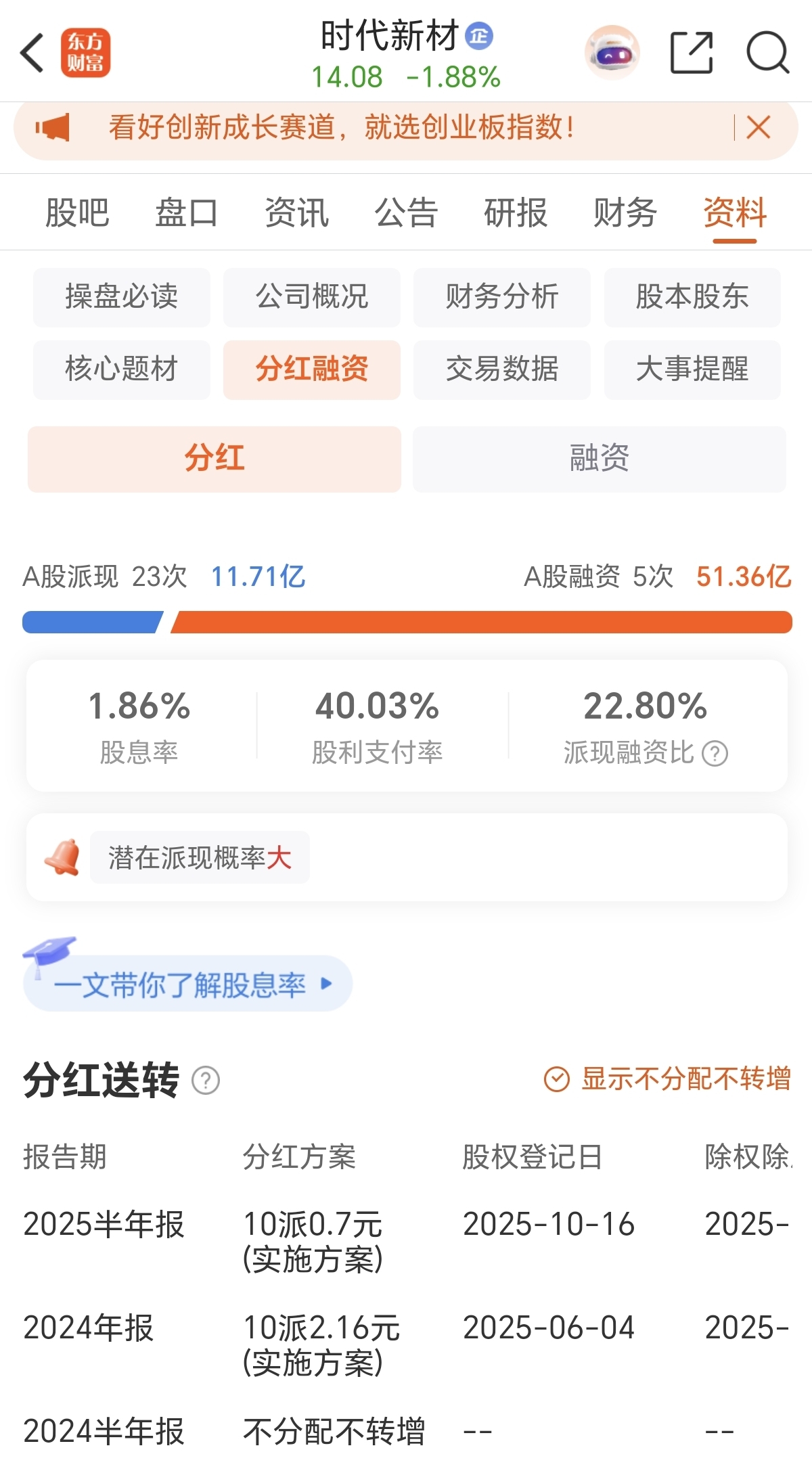 $时代新材(SH600458)$ 仔细看看时代新材的分红融资比,时代新材的分红到底是它赚来的,还是融来的?