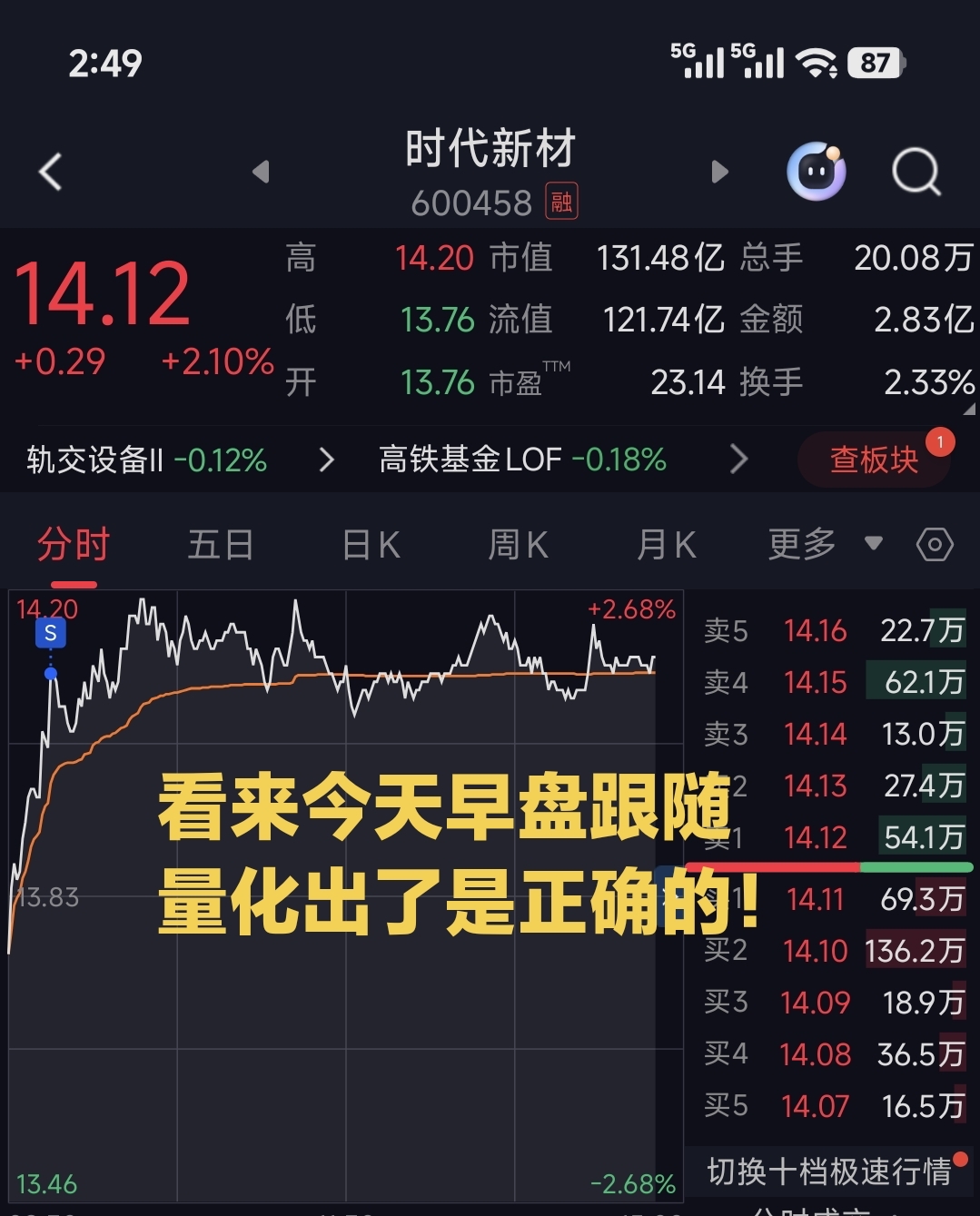 $时代新材(SH600458)$ 看来今天早盘跟随量化出了是正确的!