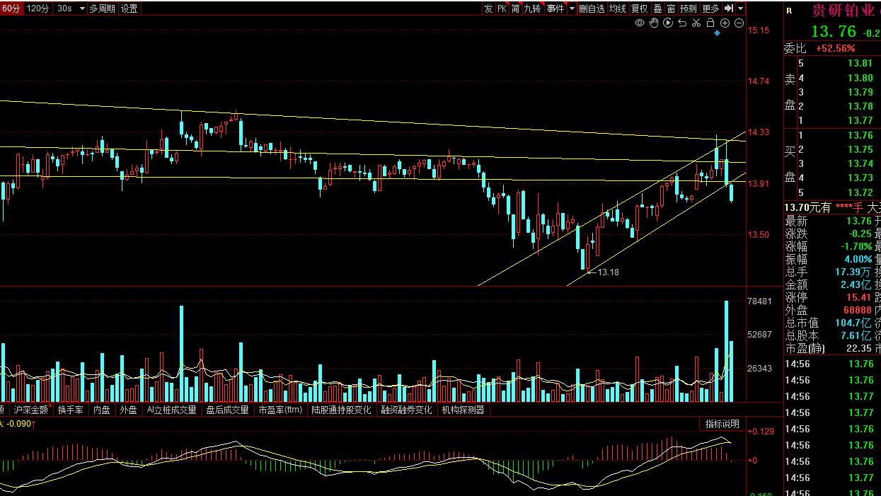 遗憾,未能带量冲破阻力位14.25,这个V形底不够坚挺,主力反手杀破了重要支撑1