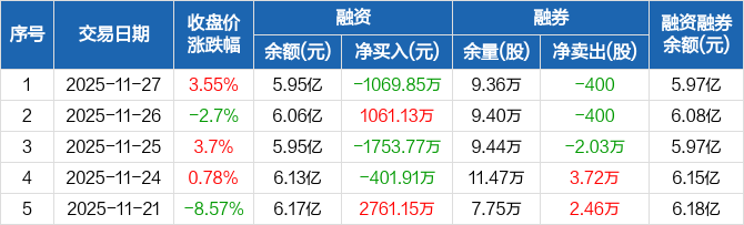 贵研铂业:融资净偿还1069.85万元,融资余额5.95亿元(11-27)