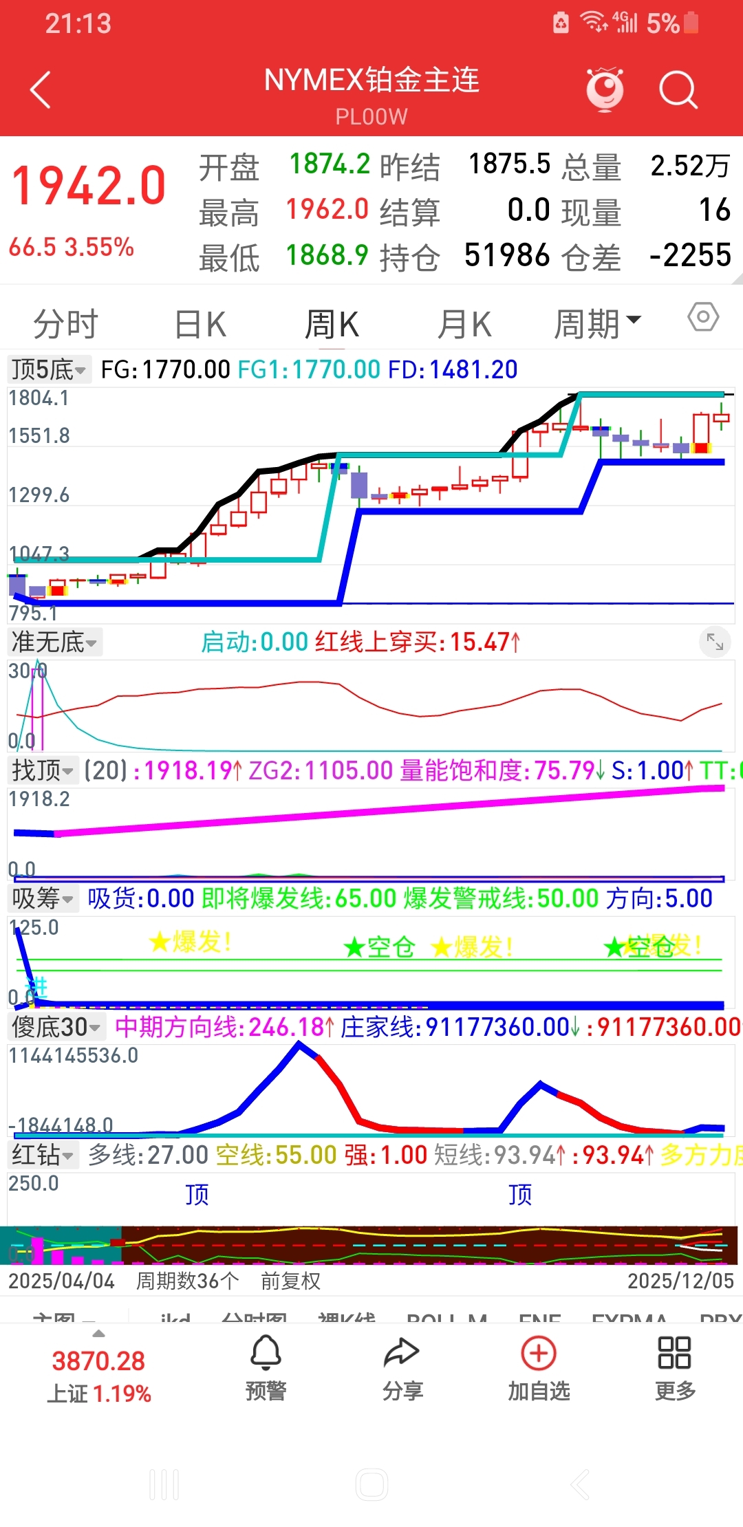 $贵研铂业(SH600459)$ nymex铂周线三波上涨:第一浪15周,第三浪11周,第五浪至今是6周(感觉应该有7周见顶)