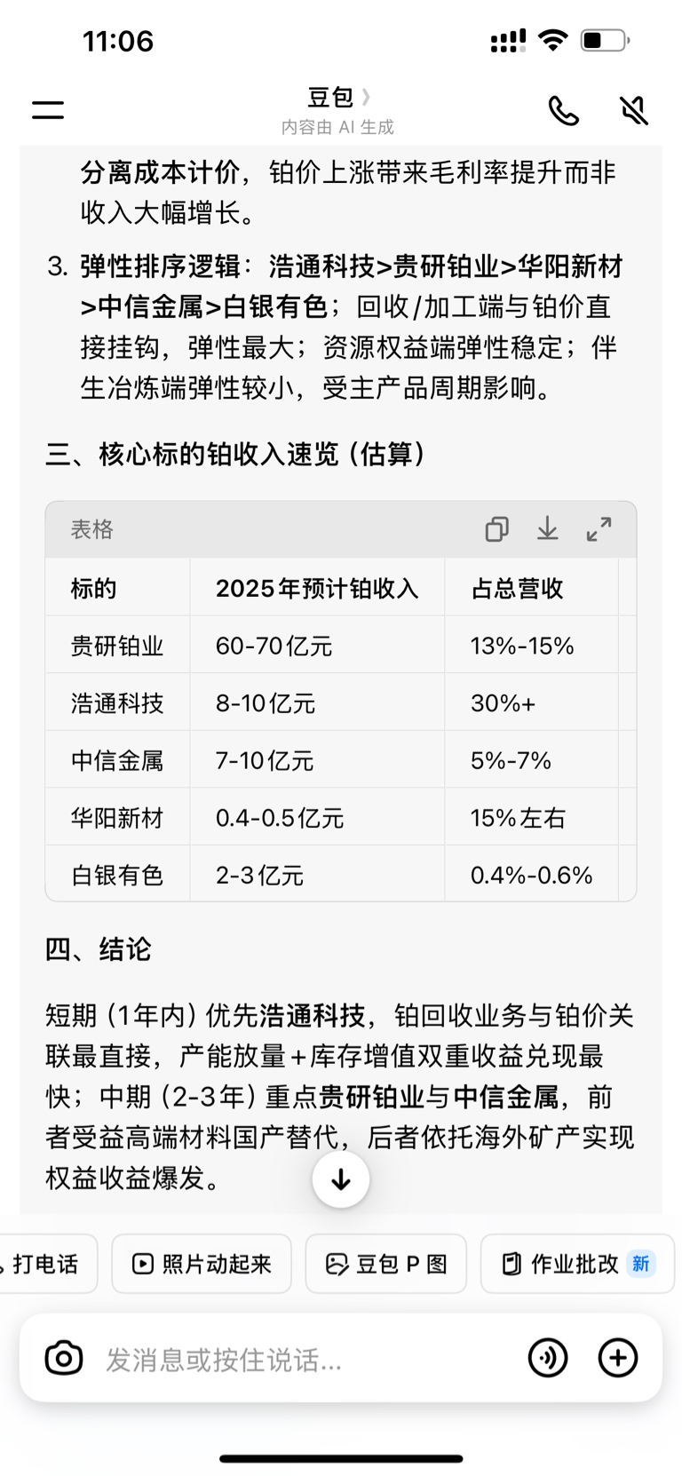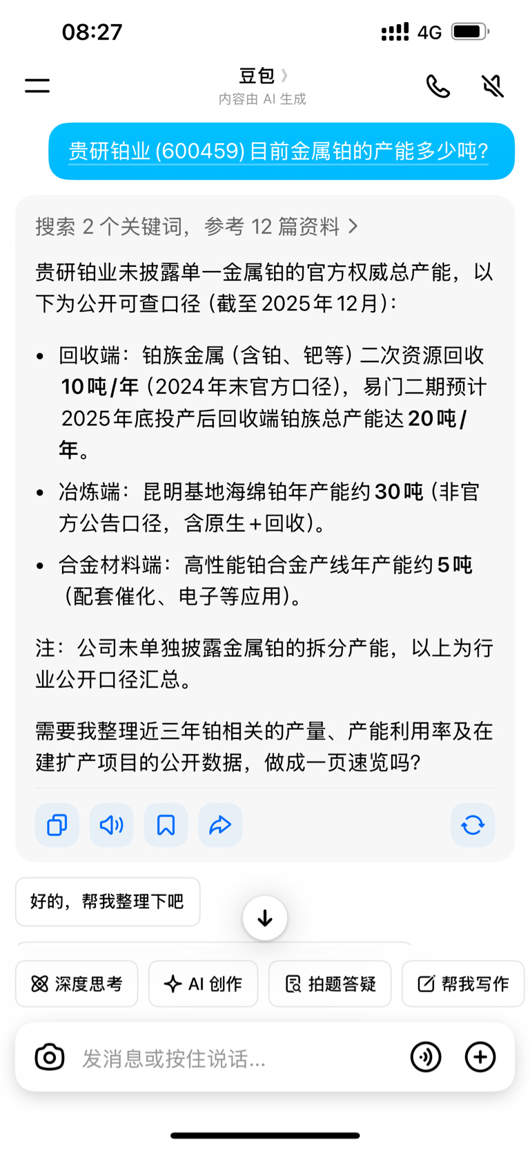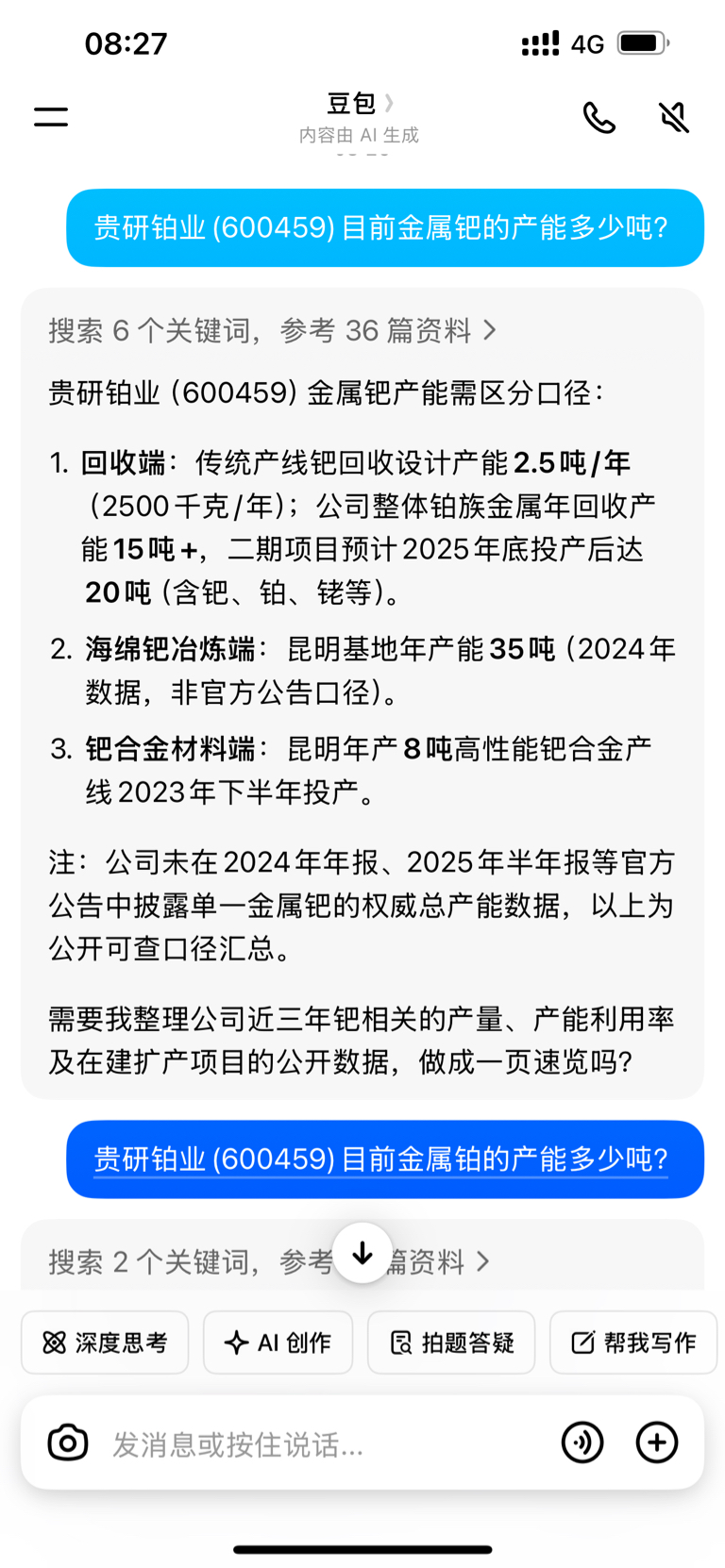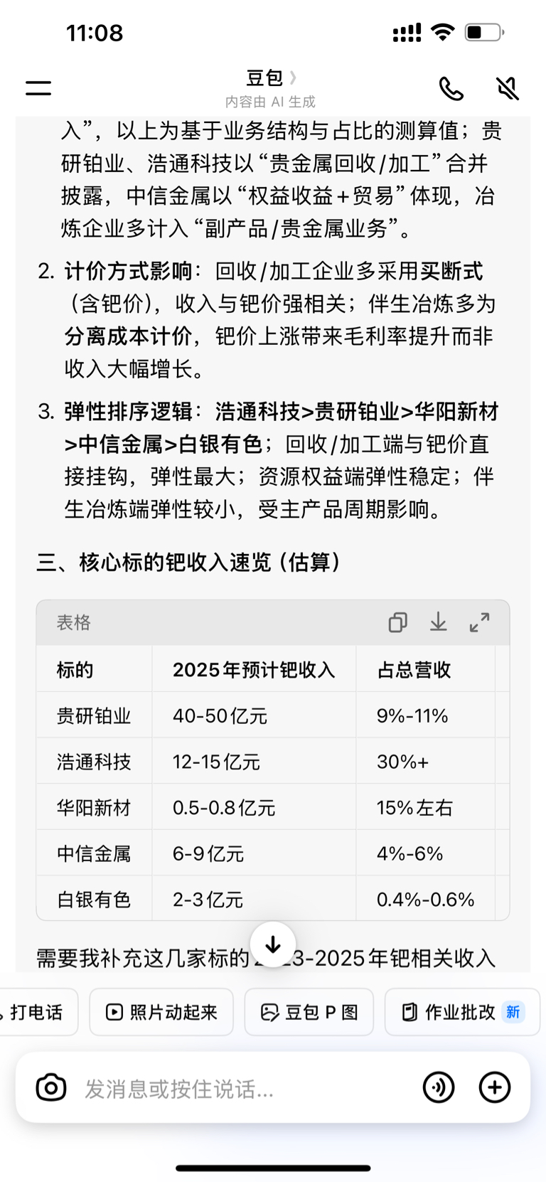 最近钯和铂每吨都涨了一亿多,问豆包看也不确定铂和钯的产能有多少吨,按收入端最低的