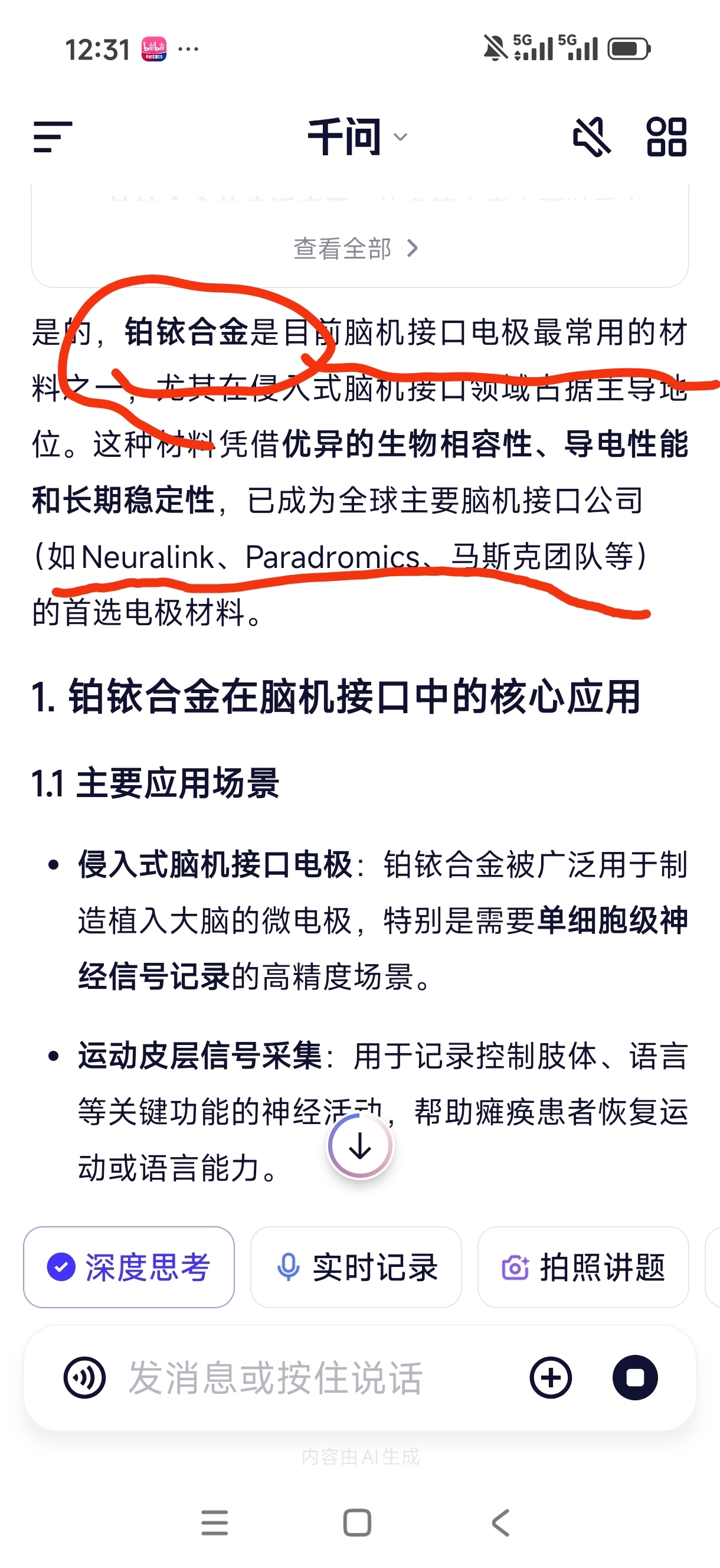 马斯克公司用的脑机接口材料是铂铱,冲啊!!!