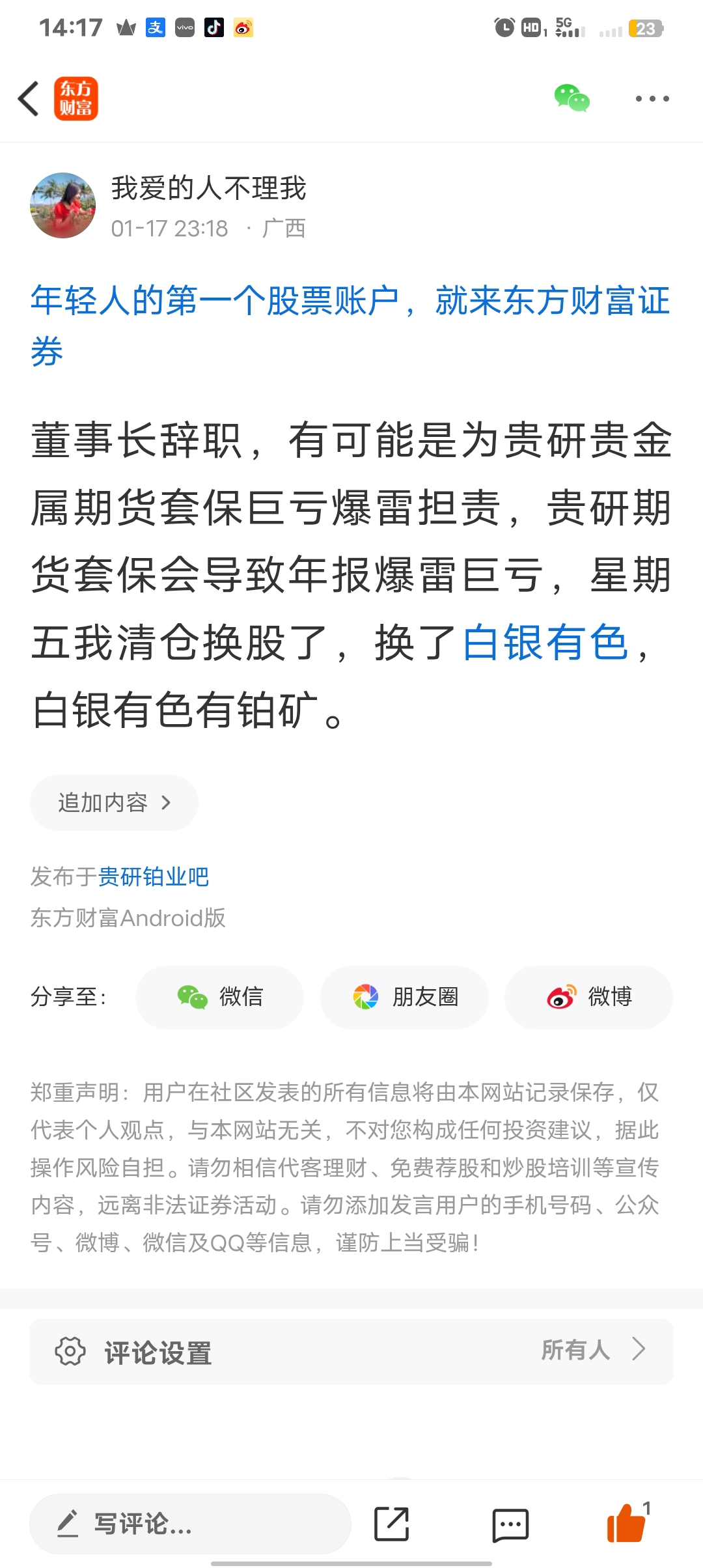 $贵研铂业(SH600459)$ 再多跌点,我在15元等。我17号叫大家清仓贵研换白银有色,白银有色今天涨停,挣大了。