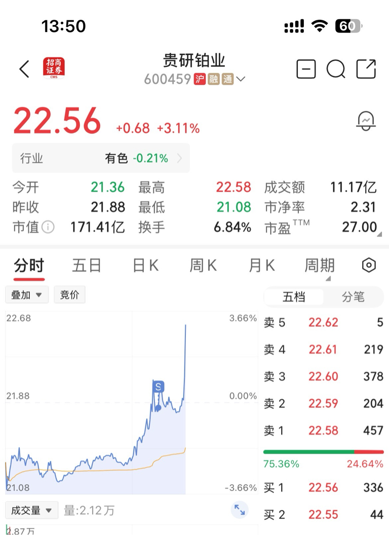 $贵研铂业(SH600459)$ 一忍了几天了 一卖就涨