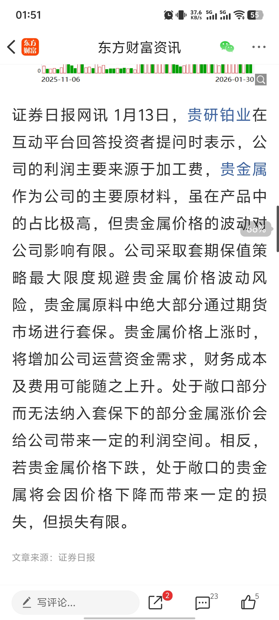$贵研铂业(SH600459)$ 我也买了这个票,大家不必唱多也不必唱空,股票的涨跌并不会因为我们打几个字而受到影响,祝大家安心过好周末,难得休息俩天。我知道很多人看到今天白银铂金这些贵金属暴跌对下周一走势很担心,怕跌停出不来也有觉得它涨的不多,想跌停抄底的。在这里我说一句,其实这个公司公告早就说清楚了,公司采取的套期保值的策略,所以这波贵金属暴涨,却没有主力来炒作的原因。说句通俗易懂的话,无论期货大涨大跌,公司根据手上现货结合期货买涨买跌形成对冲。说白了这波跟着情绪错杀,早晚会修复的,安心睡觉吧。
